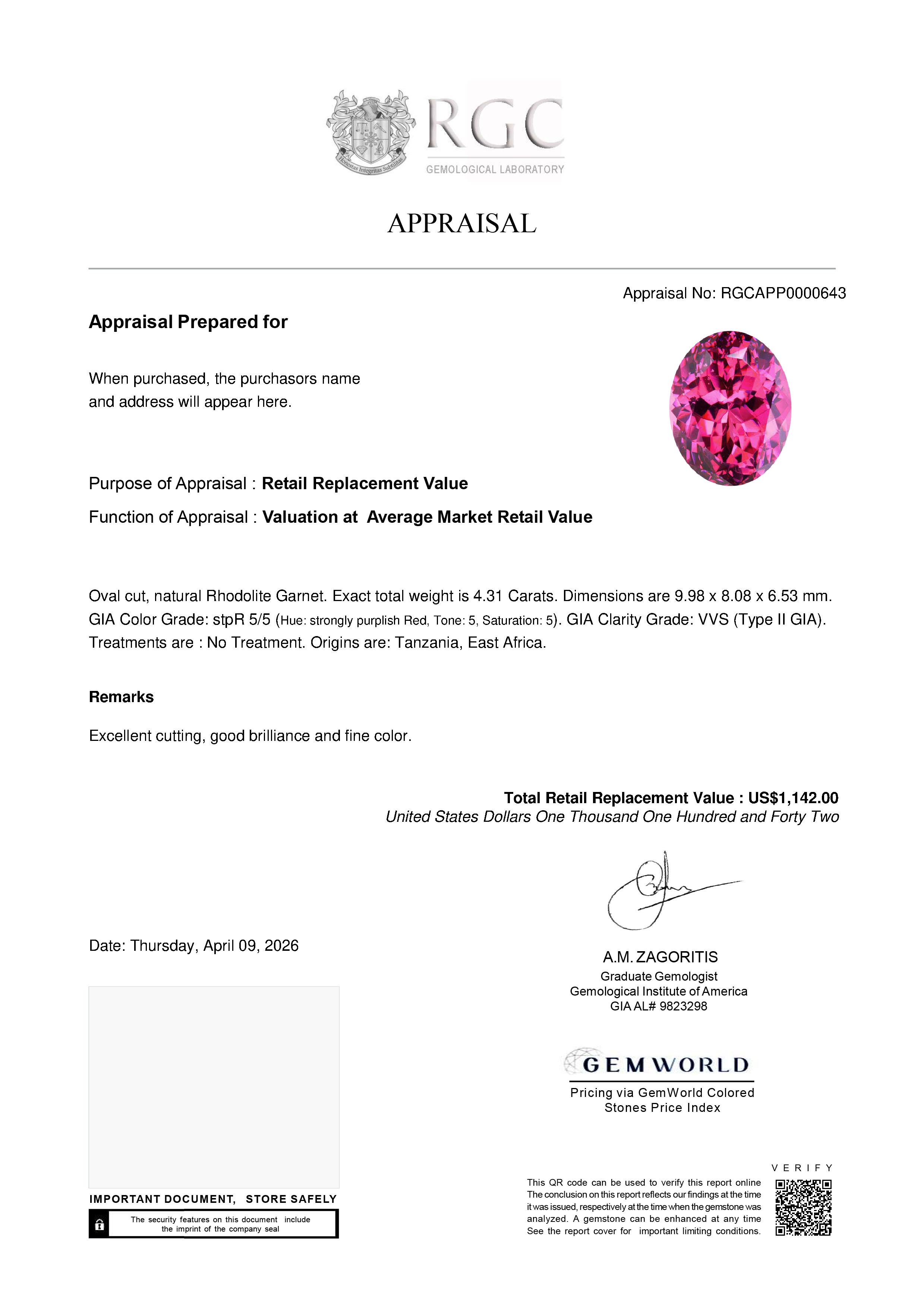 A stunning Rhodolite from the recently discovered deposit in Tanga, in Tanzania. A superb "open" slightly purplish red hue with excellent brilliance that is characteristic of this deposit.