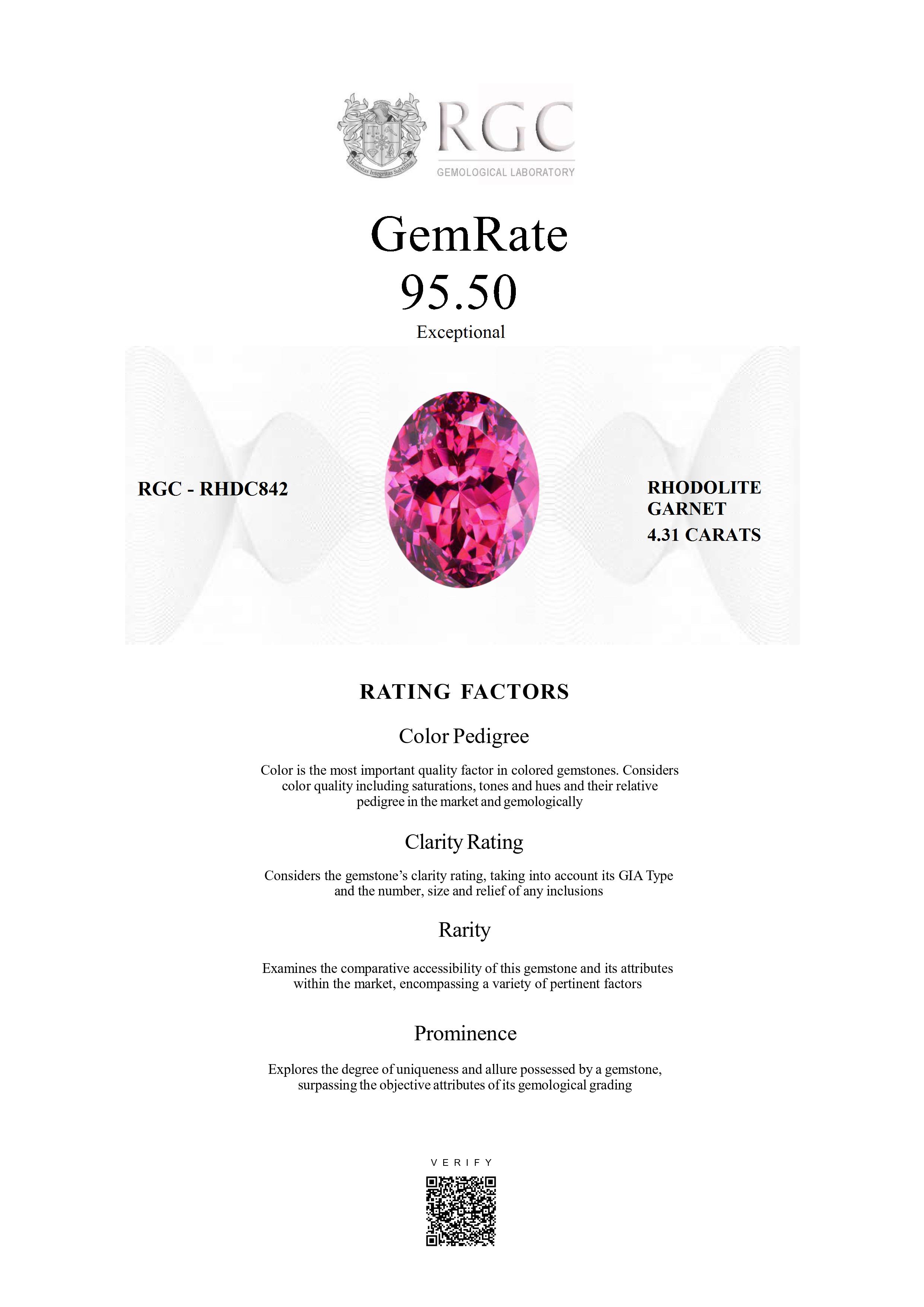 The RGC GemRate is a revolutionary system that addresses the importance and difficulty of comparing different colored gemstones with their peers in the marketplace. It assesses a wide variety of factors that exist in the marketplace and gemologically to classify gems in their genre using a standardized rating system. These factors are myriad but include quantifiable factors like color grade, clarity and cut, rarity factors examining relative rarity and also qualitative factors such as prominence, which examines the degree to which a gemstone stands out and captivates beyond just its measurable quality traits. It's essentially the stone's ability to catch attention and distinguish itself from others.