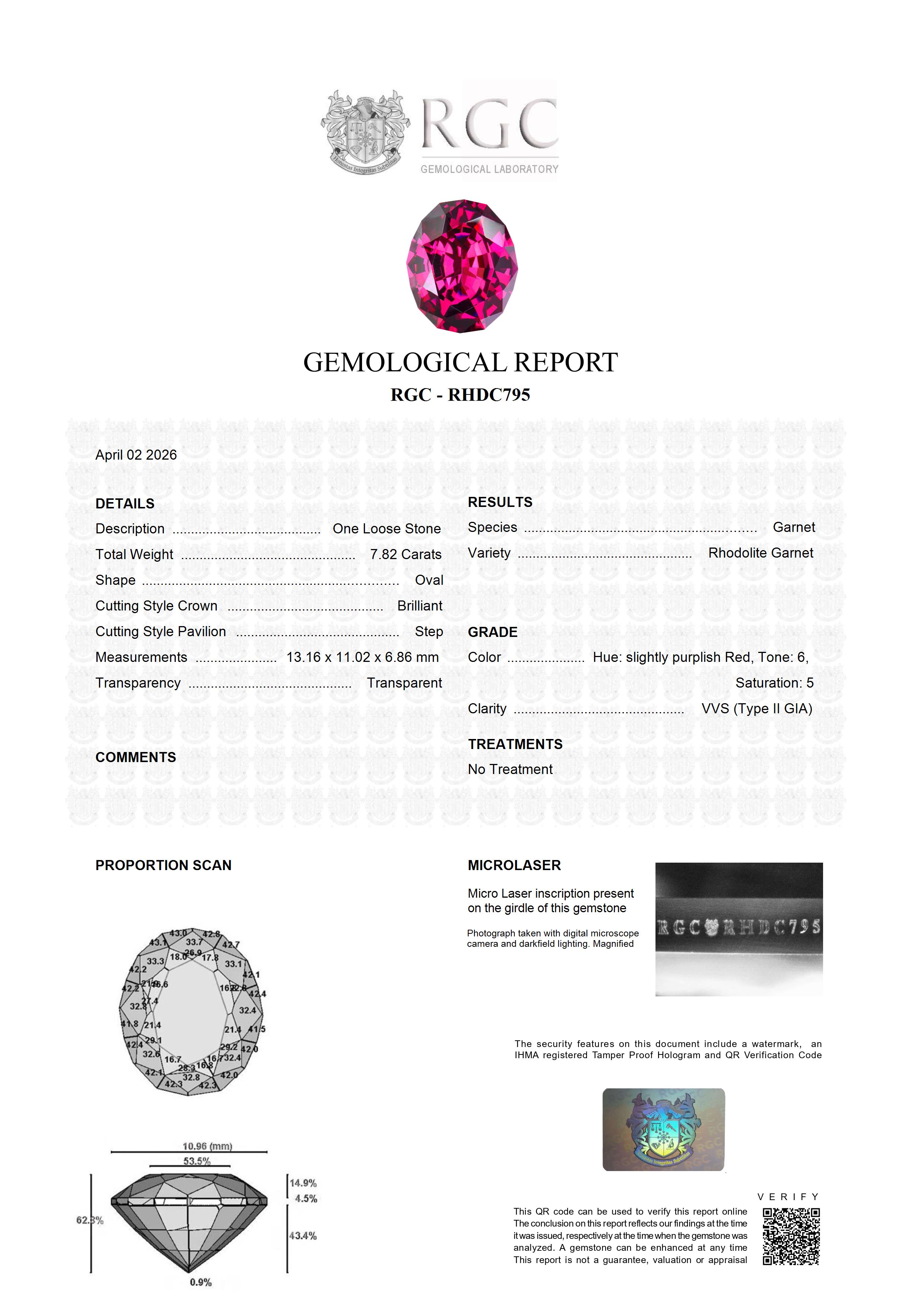 This exceptional 7.82-carat rhodolite garnet is a striking display of precision craftsmanship and natural beauty. Expertly cut to exacting standards, each facet is aligned to maximize brilliance, allowing the gemstone to radiate with remarkable life and intensity. Its color is truly distinguished—a rich, royal red infused with subtle hints of purple, creating a majestic and captivating hue that sets it apart from more common garnets. With flawless clarity, the stone offers a pristine, uninterrupted view into its luminous interior, where light ignites a vivid inner fire. Bold yet refined, this rhodolite garnet embodies elegance, rarity, and enduring sophistication, making it a compelling centerpiece for fine jewelry or a distinguished addition to any collection.