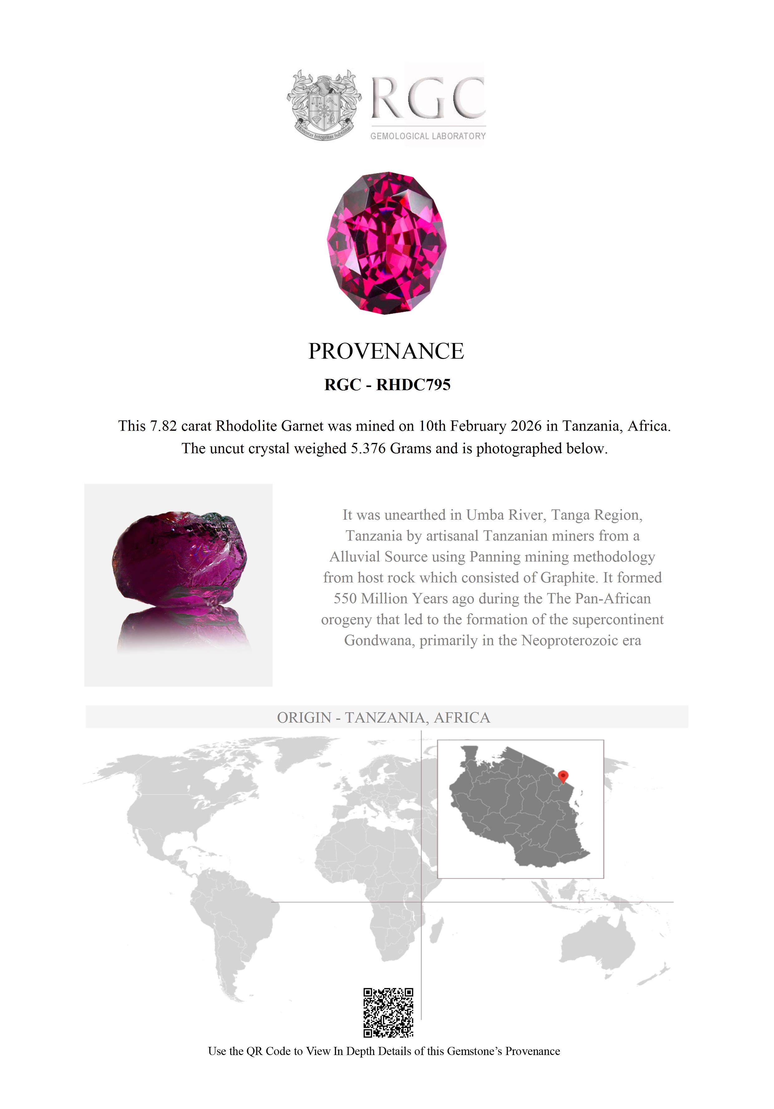 Near the small village of Mnazi, in the Usambara Mountains of Tanzania, a dirt track winds down the valley following the northern tributary of the famous Umba River. From here the road heads southwards and then eastwards to the Gerevi Hills. As the Umba River meanders through these hills it has for centuries deposited a gem gravel on the twists and bends of the river. It is among these deposits that this Rhodolite was found.