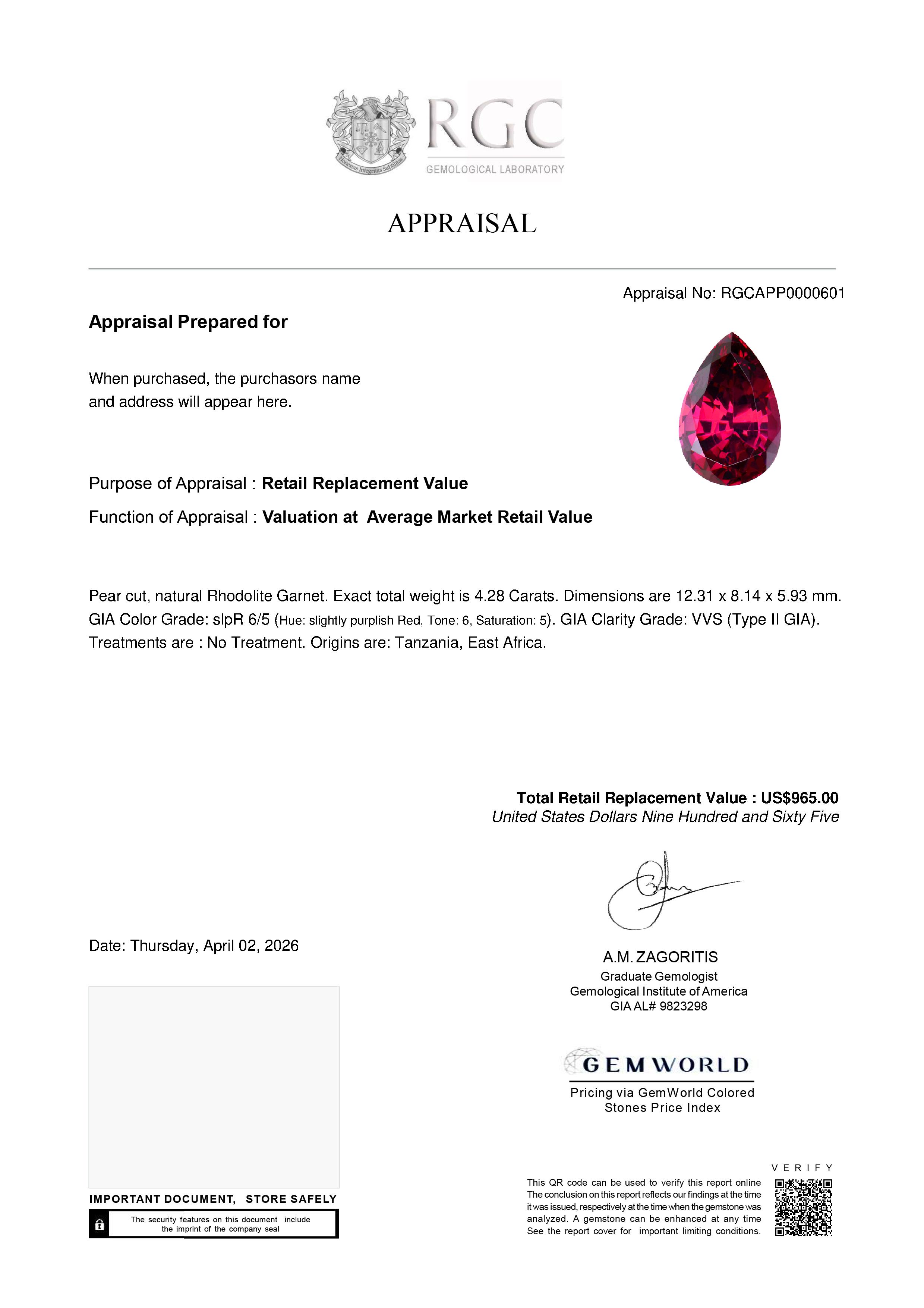 Our GemRate system was devised by our GIA Gemologists to provide a snapshot of a gemstone’s pedigree. This report is shipped with the gemstone.