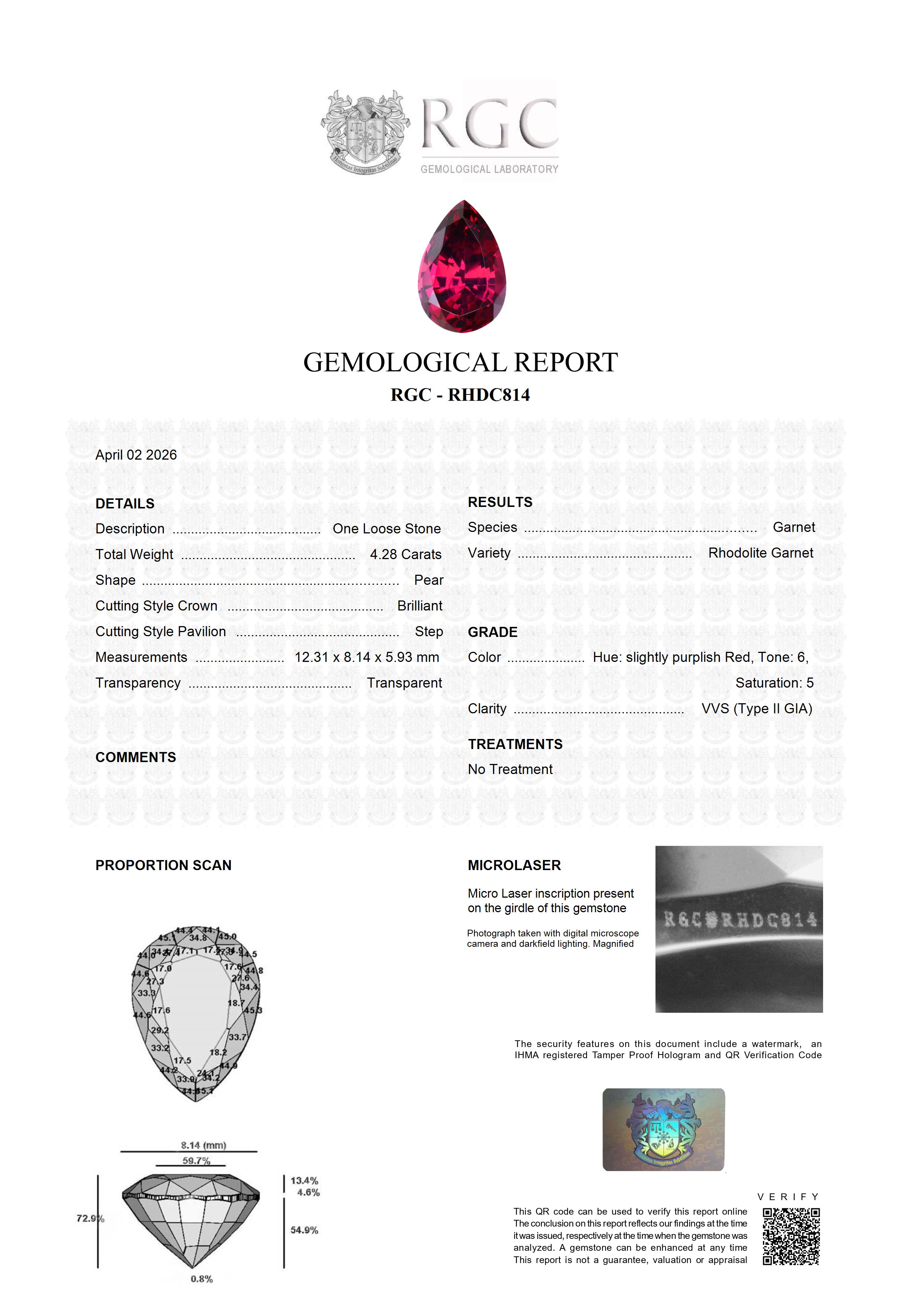 This exceptional 4.28-carat rhodolite garnet, fashioned in a refined pear brilliant cut, is a striking display of elegance and precision. It boasts a rich, almost velvety red hue with sumptuous depth, beautifully accented by subtle hints of purple. Sourced from the renowned Umba Valley in Tanzania, the gemstone reflects the region’s reputation for producing stones of remarkable character and saturation. With flawless clarity, it reveals a pristine interior where light ignites a vivid, captivating glow. Radiating intensity and brilliance, this rhodolite garnet is a distinguished gem, perfectly suited for a statement piece of fine jewelry or an important collection.