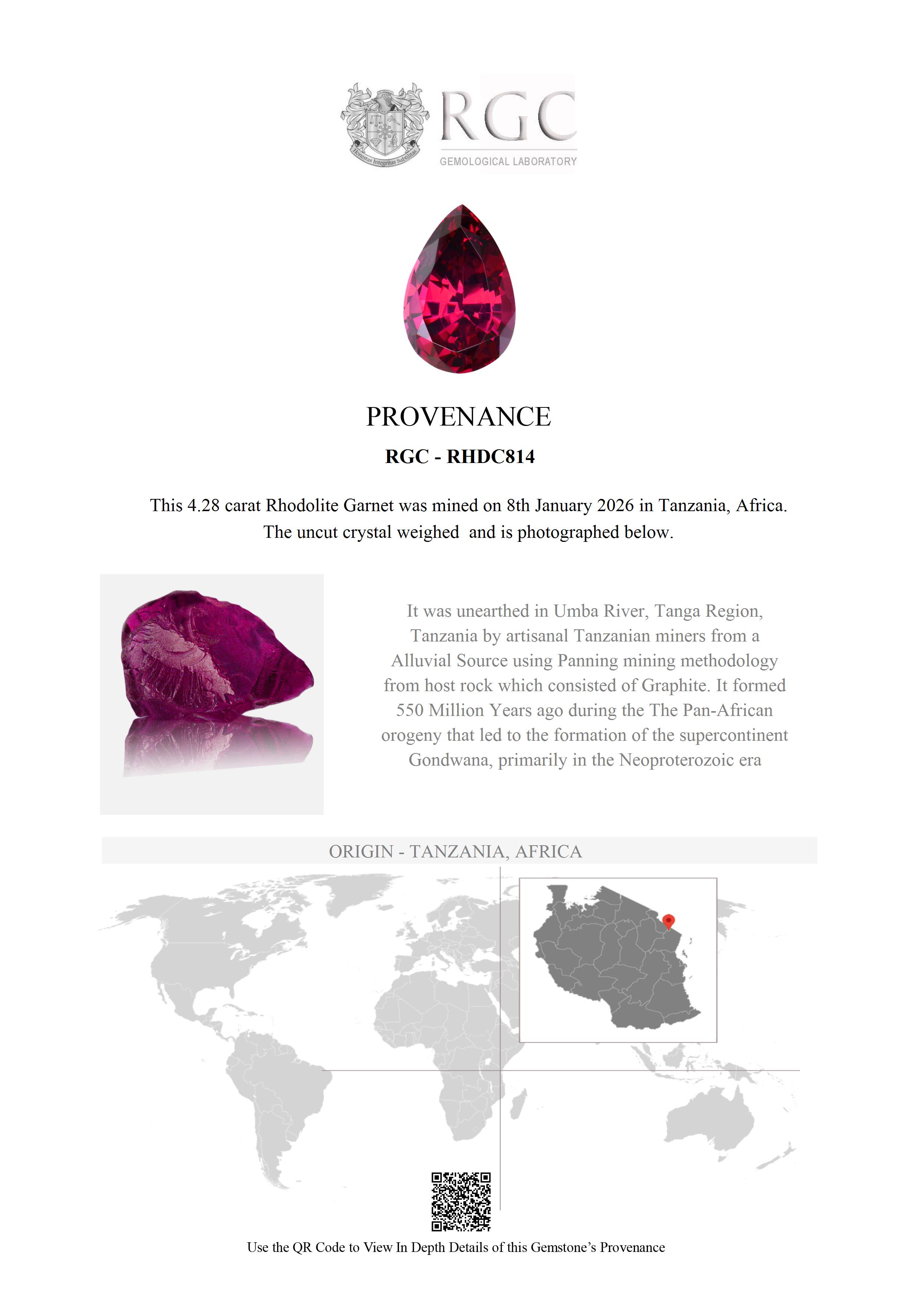 Near the small village of Mnazi, in the Usambara Mountains of Tanzania, a dirt track winds down the valley following the northern tributary of the famous Umba River. From here the road heads southwards and then eastwards to the Gerevi Hills. As the Umba River meanders through these hills it has for centuries deposited a gem gravel on the twists and bends of the river. It is among these deposits that this Rhodolite was found.