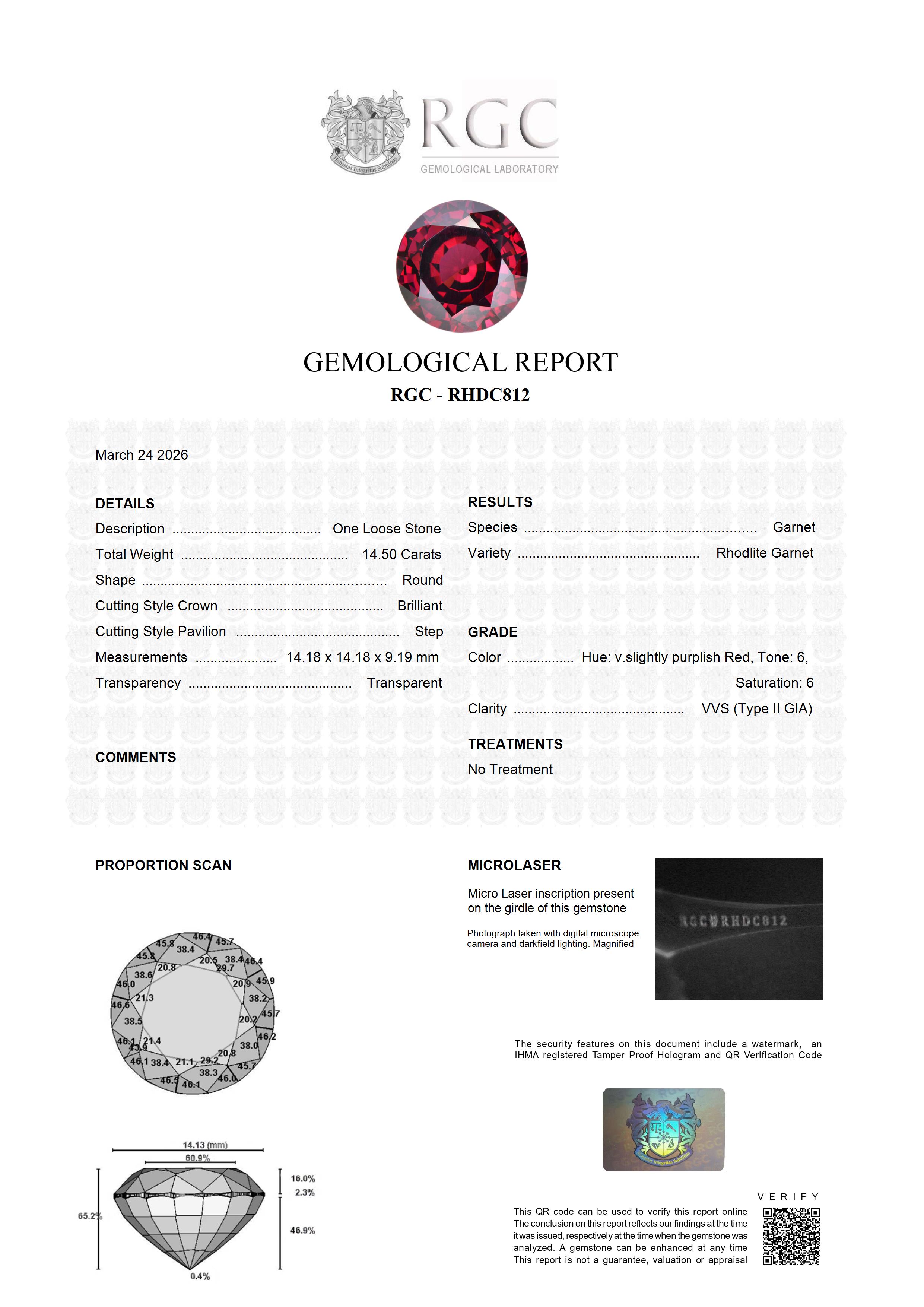 This 14.50 carat Round Brilliant Rhodolite Garnet is truly remarkable and possesses a commanding presence. Its intense and opulent deep red hues exude a regal quality that is absolutely breathtaking. The flawless perfection of the gemstone compels your gaze to be captured by its enchanting velvety depths. The superb quality of the cutting accentuates its natural beauty, creating a resplendent and magnificent display.