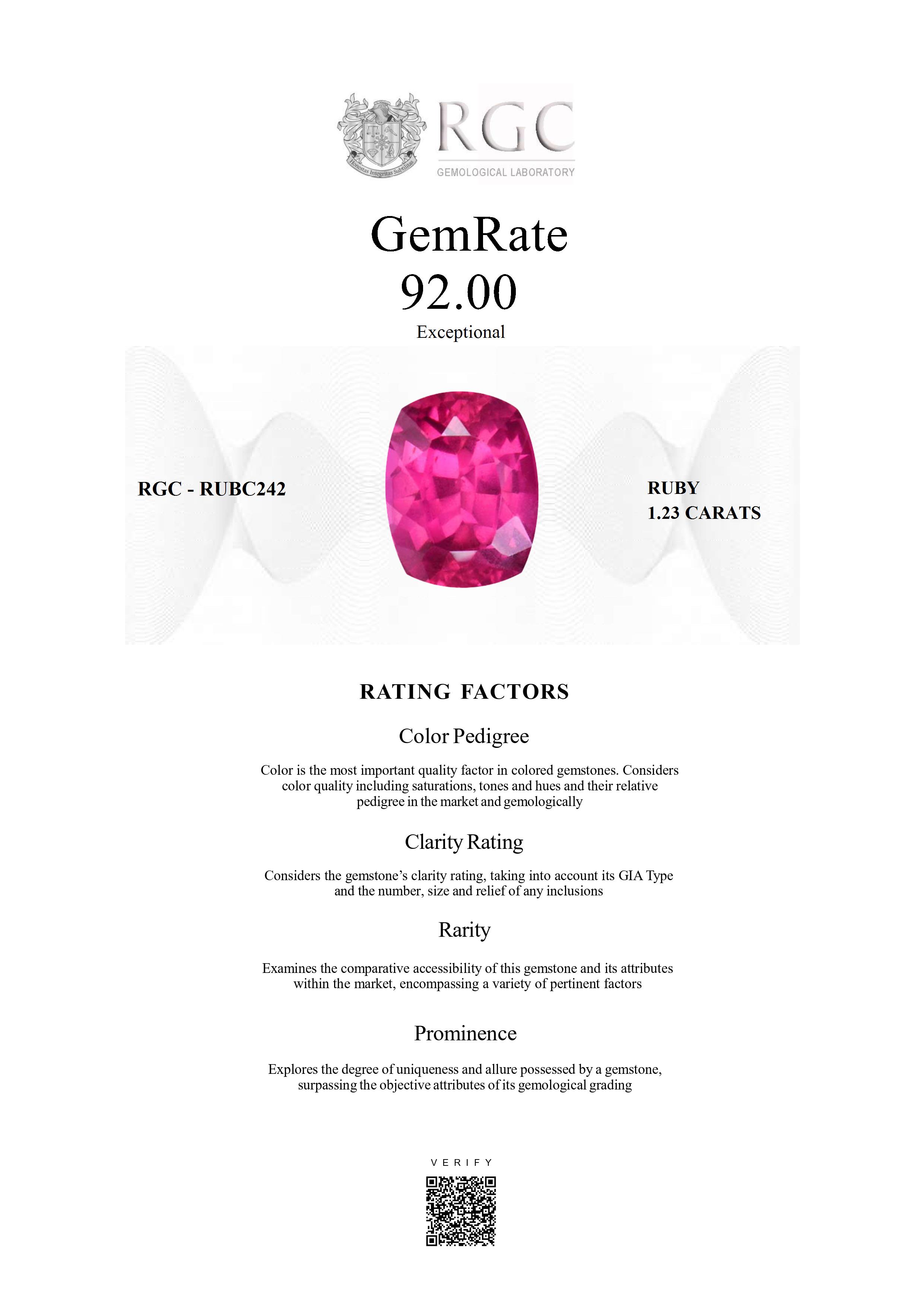 The RGC GemRate is a revolutionary system that addresses the importance and difficulty of comparing different colored gemstones with their peers in the marketplace. It assesses a wide variety of factors that exist in the marketplace and gemologically to classify gems in their genre using a standardized rating system. These factors are myriad but include quantifiable factors like color grade, clarity and cut, rarity factors examining relative rarity and also qualitative factors such as prominence, which examines the degree to which a gemstone stands out and captivates beyond just its measurable quality traits. It's essentially the stone's ability to catch attention and distinguish itself from others.
