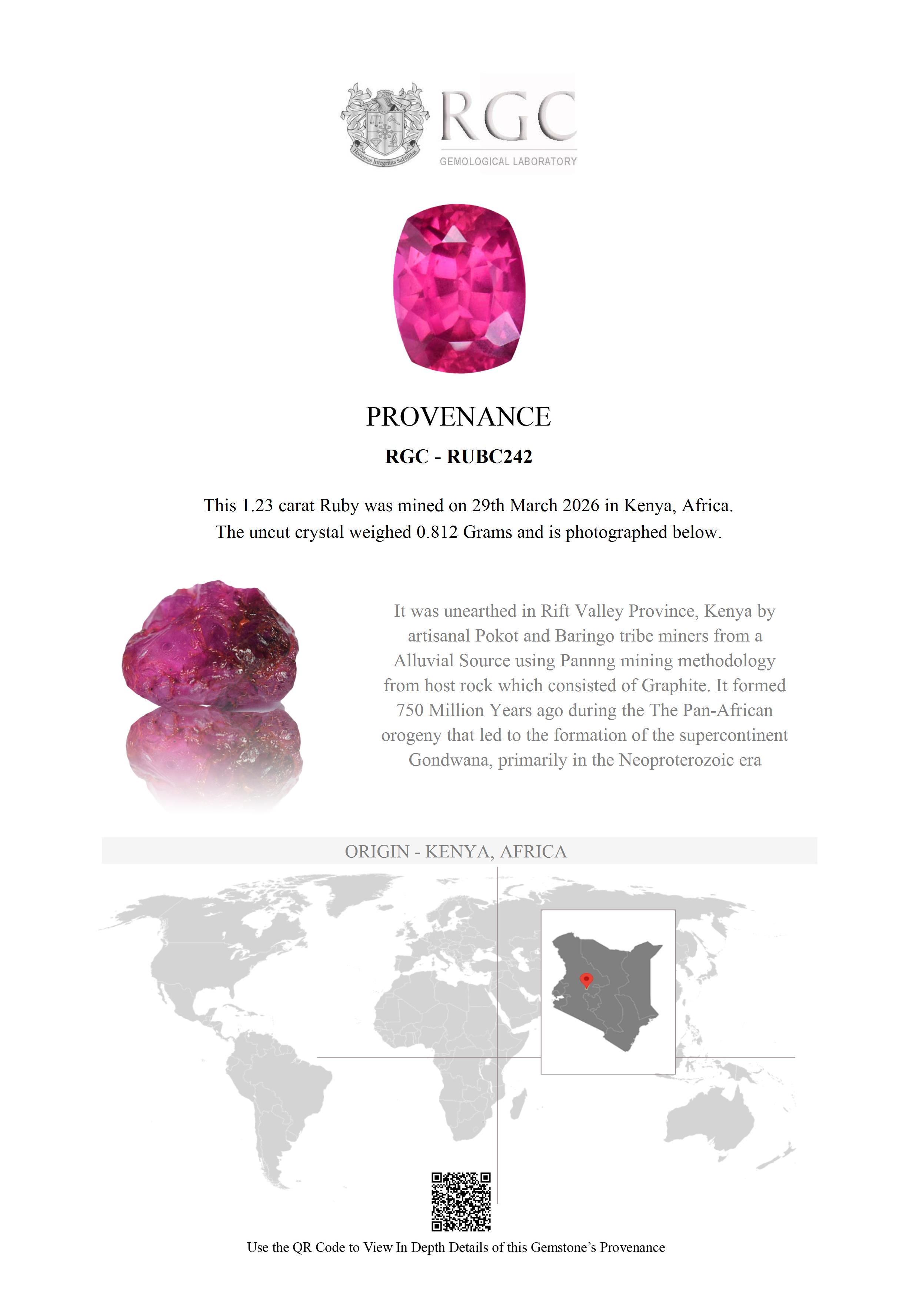 Ruby from the Baringo area of Kenya is beautiful and displays a pinkish modifier. The deposit is alluvial meaning that the Rubies initially formed hundreds of miles away in the mists of time, and were transported by ancient rivers and deposited in their present resting place. They are dug up by the local tribe as little smooth water worn pebbles.