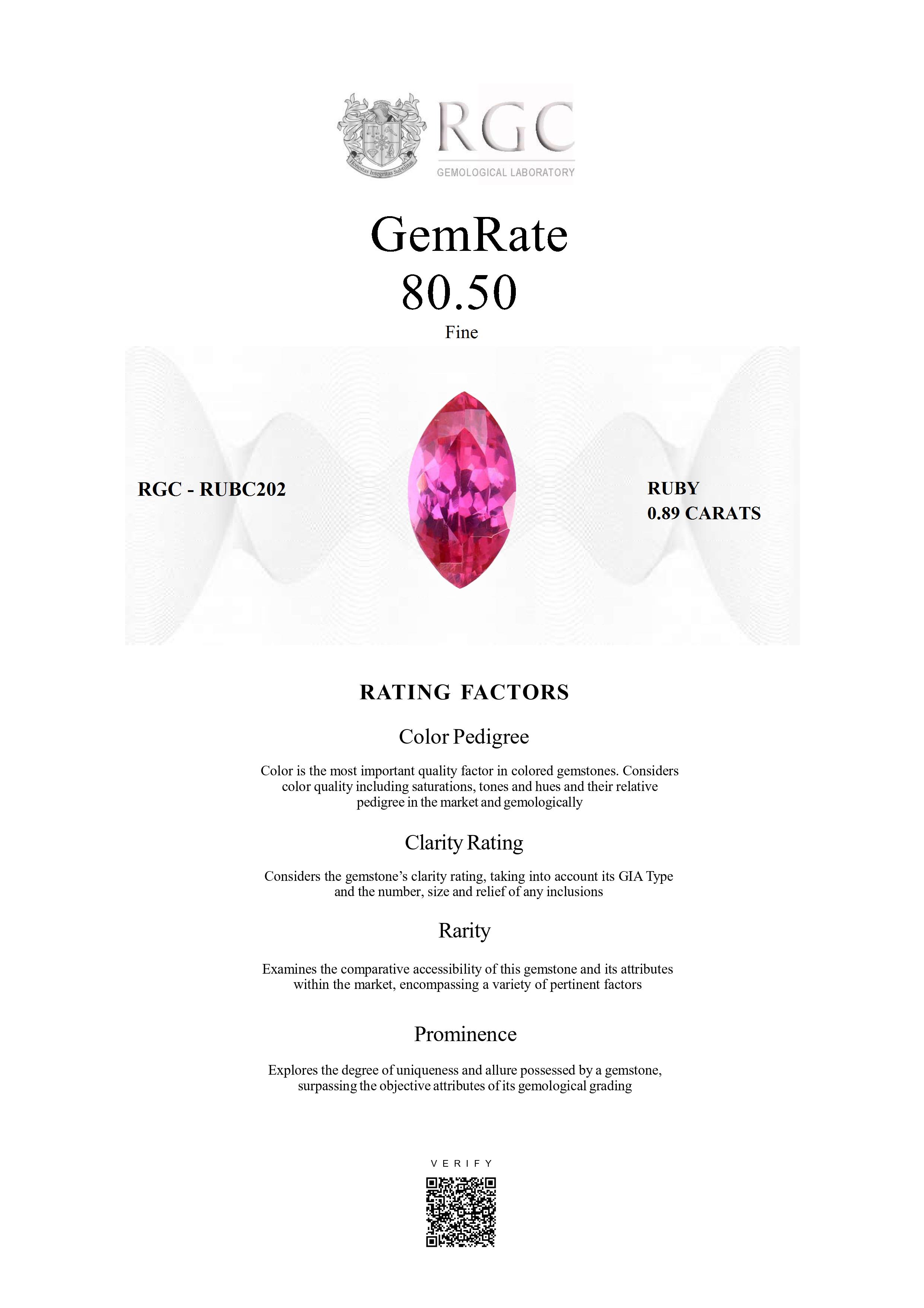 The RGC GemRate is a revolutionary system that addresses the importance and difficulty of comparing different colored gemstones with their peers in the marketplace. It assesses a wide variety of factors that exist in the marketplace and gemologically to classify gems in their genre using a standardized rating system. These factors are myriad but include quantifiable factors like color grade, clarity and cut, rarity factors examining relative rarity and also qualitative factors such as prominence, which examines the degree to which a gemstone stands out and captivates beyond just its measurable quality traits. It's essentially the stone's ability to catch attention and distinguish itself from others.