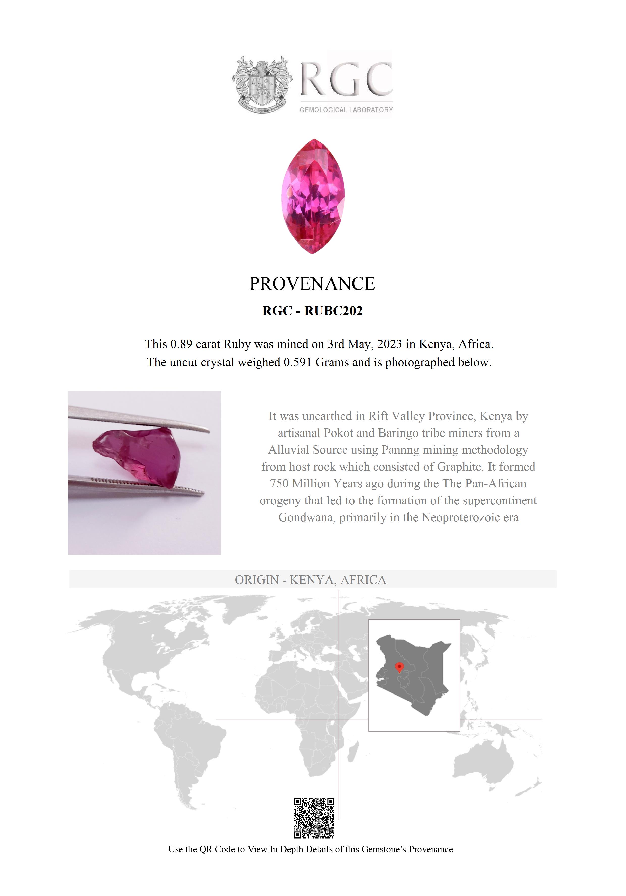 Ruby from the Baringo area of Kenya is beautiful and displays a pinkish modifier. The deposit is alluvial meaning that the Rubies initially formed hundreds of miles away in the mists of time, and were transported by ancient rivers and deposited in their present resting place. They are dug up by the local tribe as little smooth water worn pebbles.
