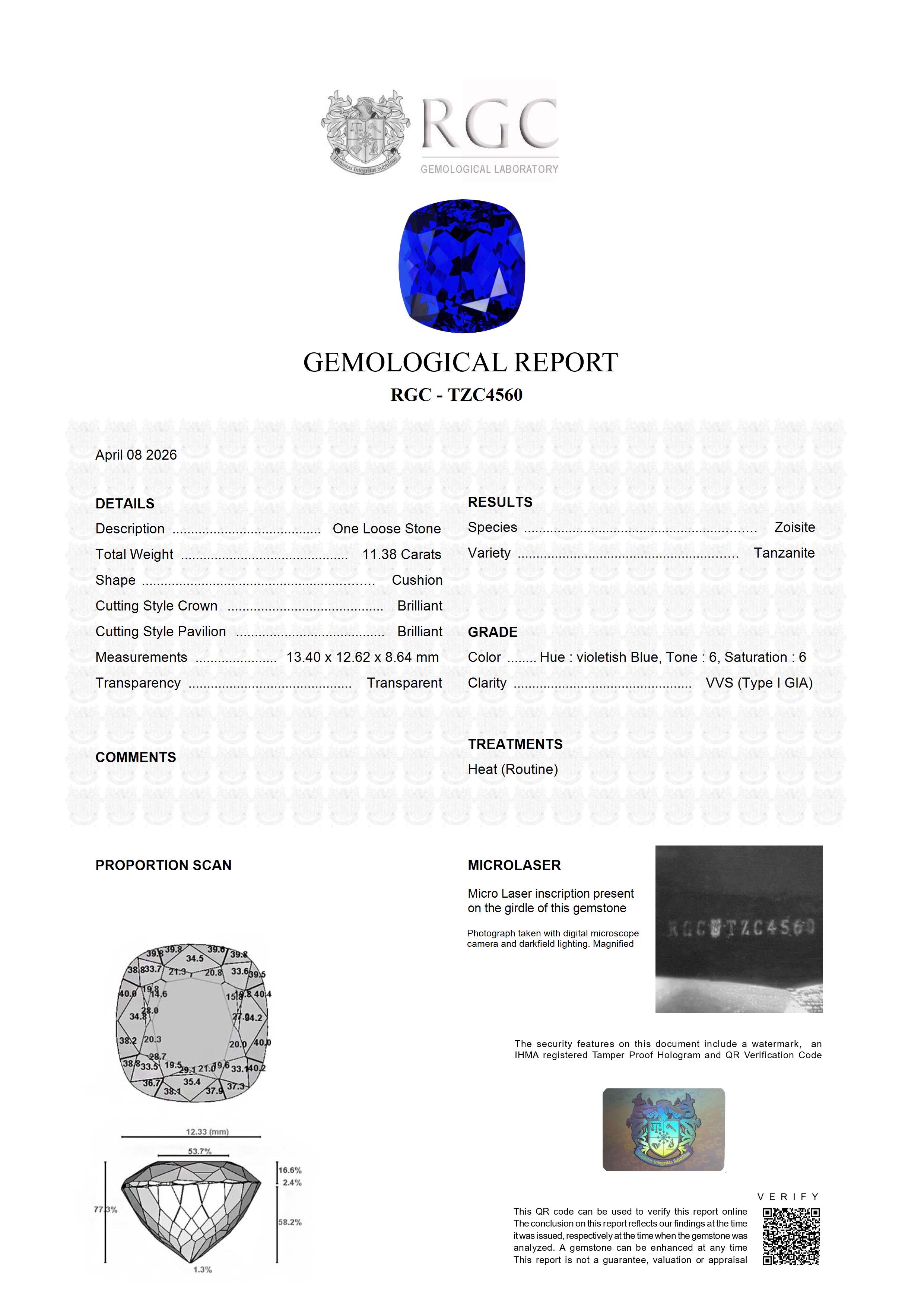 Utterly outstanding and a true investment grade Tanzanite. Surpassing even the very finest Kashmir cornflower blue Sapphire, this ethereal 10.30 carat cushion cut piece is a joy to behold. Glittering with life, the deepest most explosive color saturation possible. Flawless and professionally cut. As intense as its blue color is in daylight, it is more than evenly matched by the intensity of the red flash in incandescent light - a kaleidoscope of reds and violets emanating from deep within the stone. An extremely rare and extremely beautiful Tanzanite of the very finest pedigree.