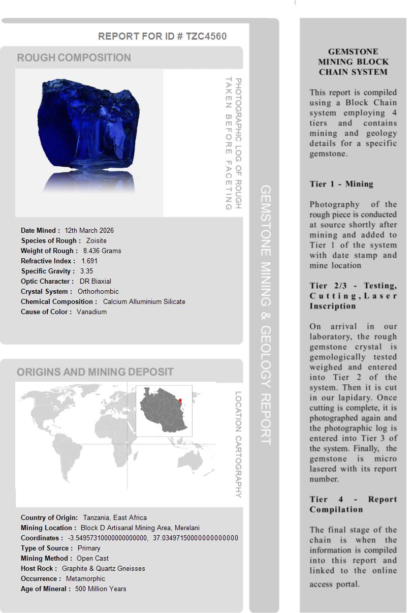 This Tanzanite is over 510 Million Years old. After being removed from the vein and "knocked" to remove the host rock, this Tanzanite weighed 8.436 Grams. The photograph on the left, shows it as it looked at this stage in its journey. Tests showed it has a Specific Gravity of 3.35, an optic character of DR Biaxial and it formed in the Othorhombic crystal system. Its Chemical Composition is Calcium Alluminium Silicate and its Cause of Color is Vanadium