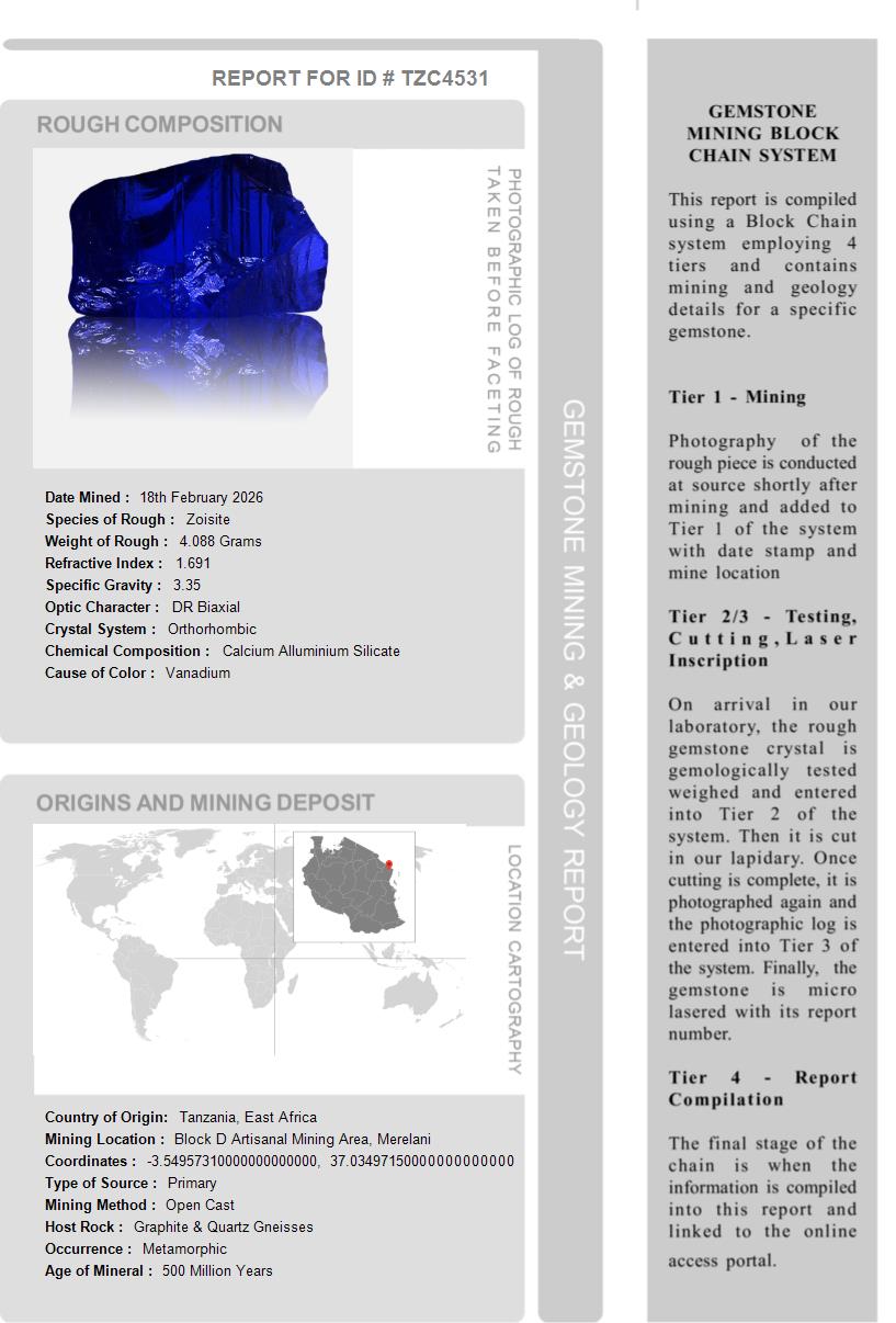 This Tanzanite is over 510 Million Years old. After being removed from the vein and "knocked" to remove the host rock, this Tanzanite weighed 4.088 Grams. The photograph on the left, shows it as it looked at this stage in its journey. Tests showed it has a Specific Gravity of 3.35, an optic character of DR Biaxial and it formed in the Othorhombic crystal system. Its Chemical Composition is Calcium Alluminium Silicate and its Cause of Color is Vanadium