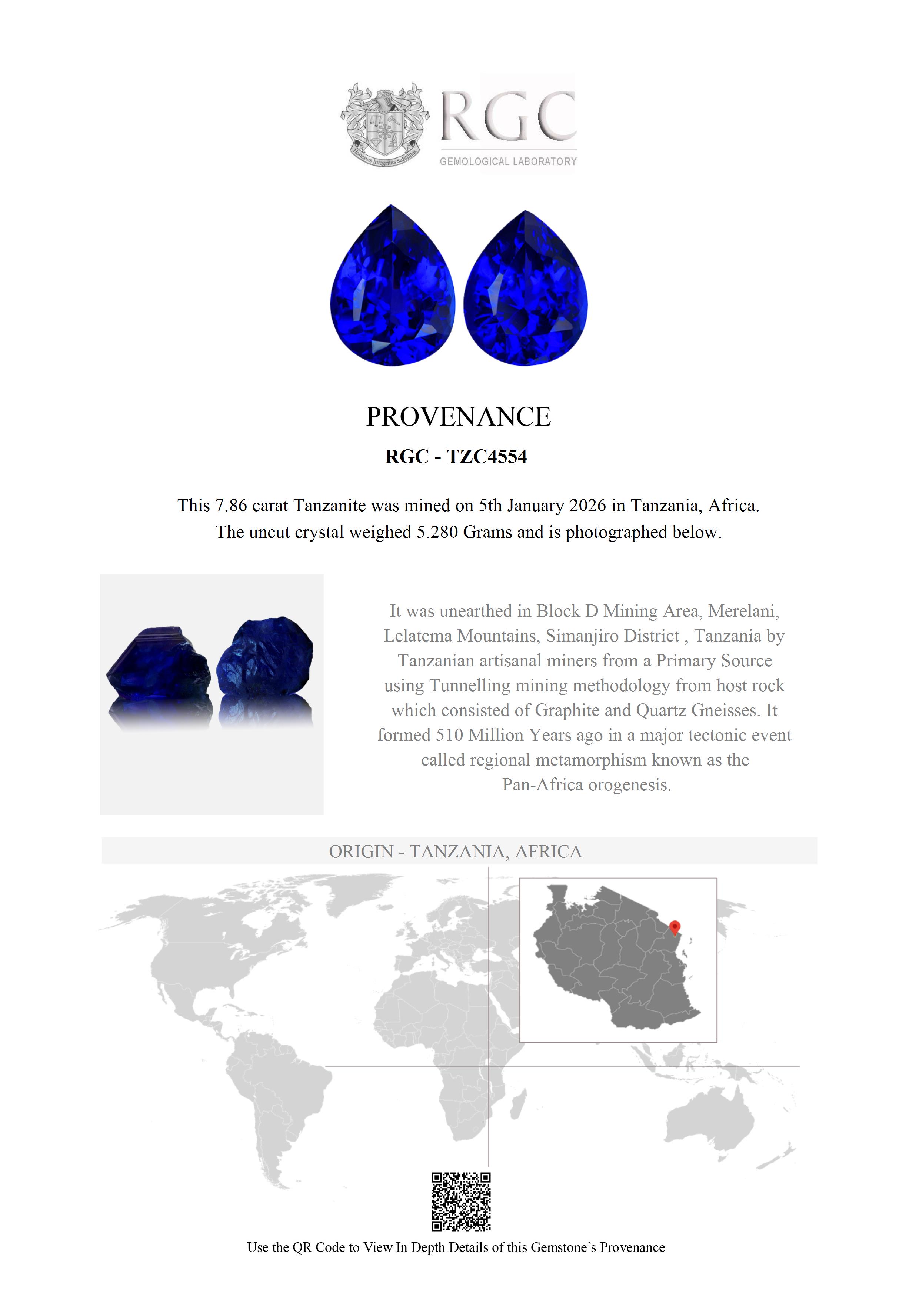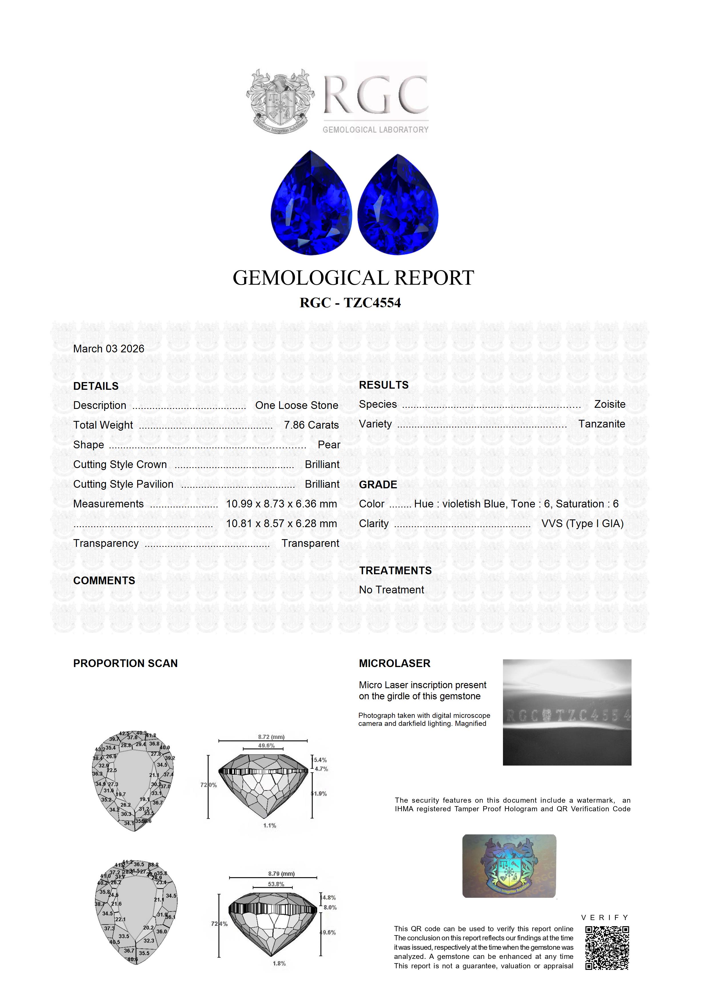 Extraordinary. What a superb pair of Tanzanites. You don't see Tanzanite often that looks like this. The color is a regal, intense Royal Blue with plenty of sparkle and intensity. Both stones display robust red flash effect in incandescent light. Both stones are flawless. If you are looking for a pair of Tanzanites and want only the best, then don't look any further. These are a rare find.