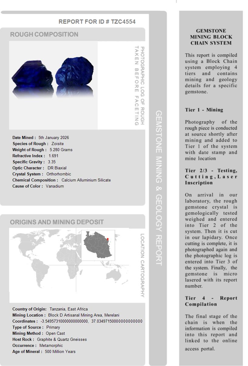 This Tanzanite is over 510 Million Years old. After being removed from the vein and "knocked" to remove the host rock, this Tanzanite weighed 5.280 Grams. The photograph on the left, shows it as it looked at this stage in its journey. Tests showed it has a Specific Gravity of 3.35, an optic character of DR Biaxial and it formed in the Othorhombic crystal system. Its Chemical Composition is Calcium Alluminium Silicate and its Cause of Color is Vanadium