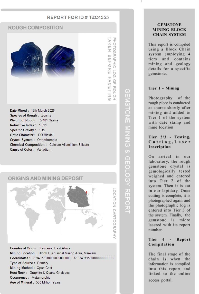 This Tanzanite is over 510 Million Years old. After being removed from the vein and "knocked" to remove the host rock, this Tanzanite weighed 5.401 Grams. The photograph on the left, shows it as it looked at this stage in its journey. Tests showed it has a Specific Gravity of 3.35, an optic character of DR Biaxial and it formed in the Othorhombic crystal system. Its Chemical Composition is Calcium Alluminium Silicate and its Cause of Color is Vanadium