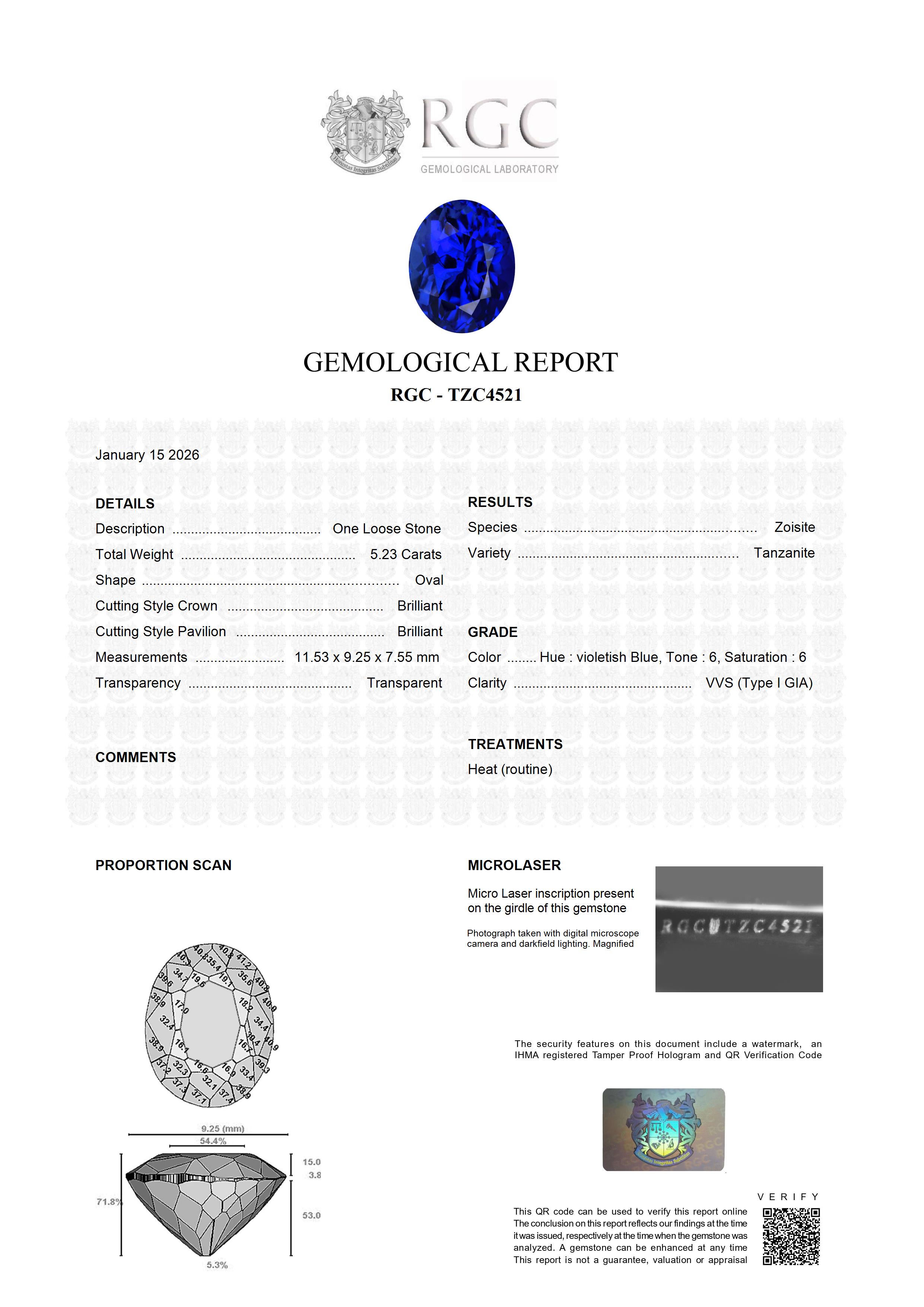 This is an exquisite 5.23 carat Oval Tanzanite. Its exceptional color takes center stage, becoming more striking with its intensity, thus increasing the Tanzanite's rarity and value. Without a single flaw, the stone's perfect cut highlights its spectacular internal luminosity, contributing to its impressive allure. Such Tanzanite gems remain a scarce treasure and a prime investment choice. This fabulous stone would create a breathtaking piece of jewelry indeed.