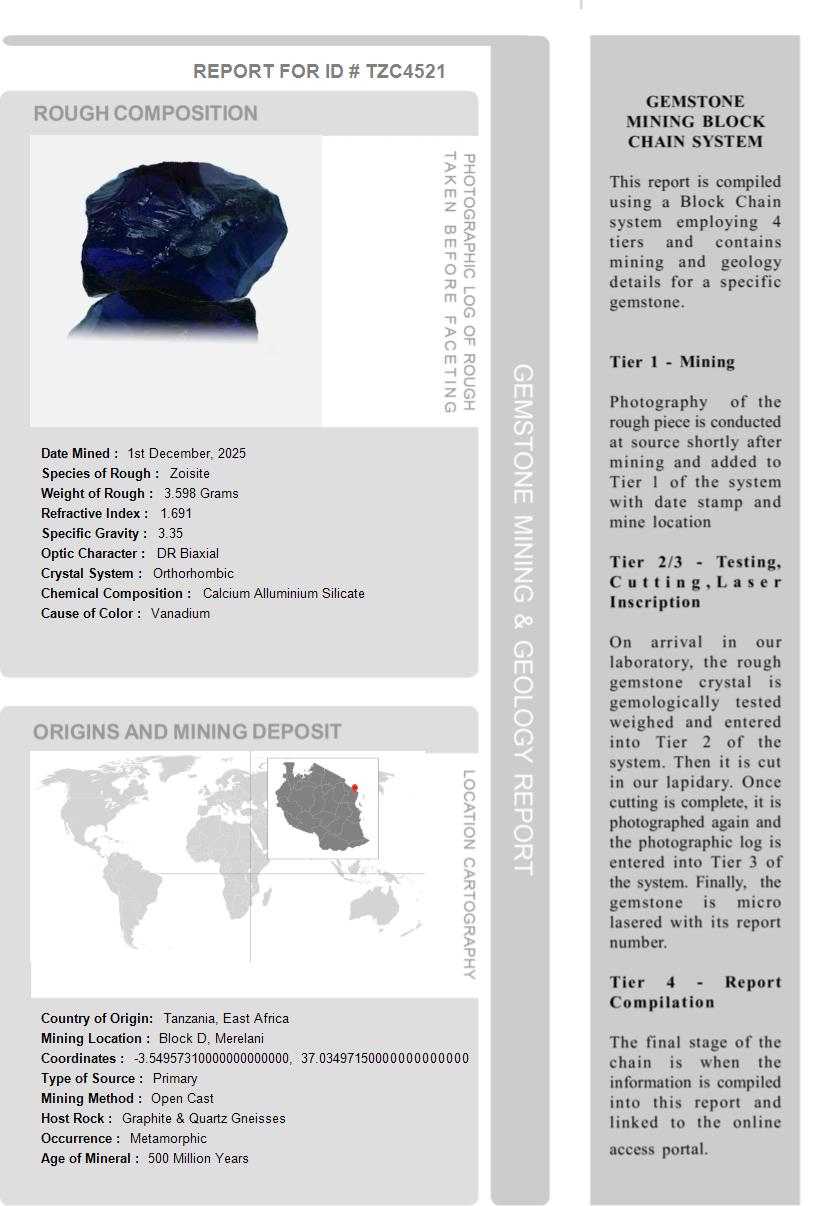 This Tanzanite is over 510 Million Years old. After being removed from the vein and "knocked" to remove the host rock, this Tanzanite weighed 3.598 Grams. The photograph on the left, shows it as it looked at this stage in its journey. Tests showed it has a Specific Gravity of 3.35, an optic character of DR Biaxial and it formed in the Othorhombic crystal system. Its Chemical Composition is Calcium Alluminium Silicate and its Cause of Color is Vanadium