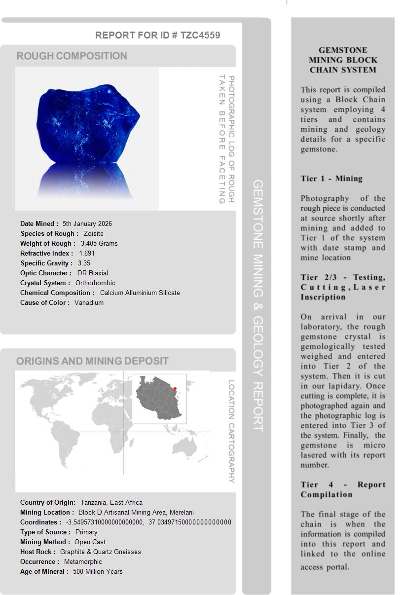 This Tanzanite is over 510 Million Years old. After being removed from the vein and "knocked" to remove the host rock, this Tanzanite weighed 3.405 Grams. The photograph on the left, shows it as it looked at this stage in its journey. Tests showed it has a Specific Gravity of 3.35, an optic character of DR Biaxial and it formed in the Othorhombic crystal system. Its Chemical Composition is Calcium Alluminium Silicate and its Cause of Color is Vanadium