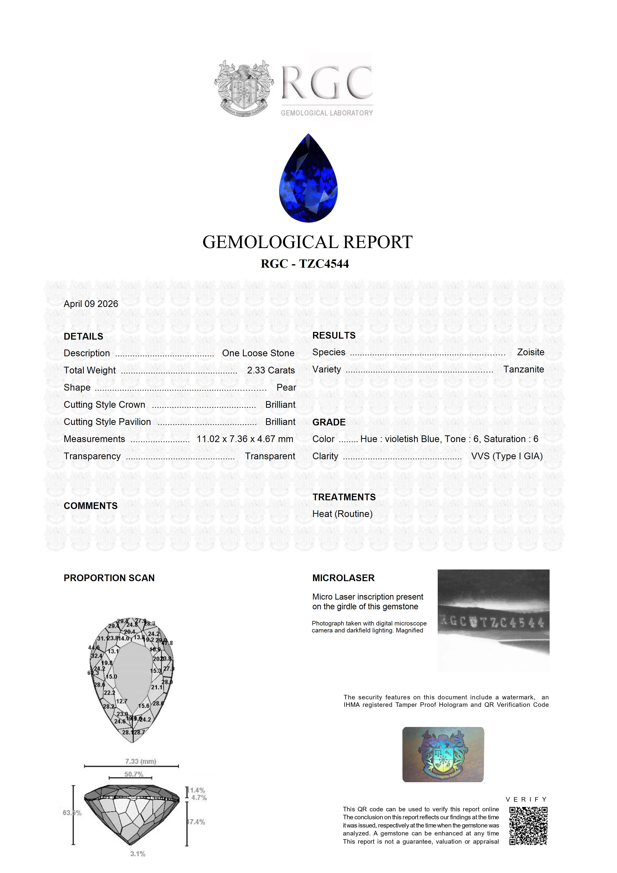 They simply don't come better, period. Colors like this are an extreme rarity but in a 2 carater, even more so. This exciting 2.33 carat pear is the pinnacle of Tanzanite quality. The color has to be seen to be believed - an intense royal blue with incredible intensity. Move over the pale purples that you usually see in the 2 carat ranges, this one would put a Kashmir sapphire in the shade. It is beautifully cut with plenty of sparkle and it is flawless. A really rare and truly beautiful Tanzanite.