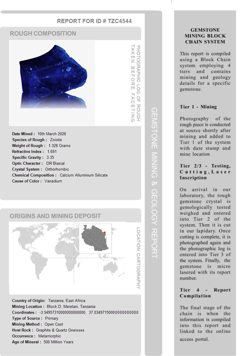 This Tanzanite is over 510 Million Years old. After being removed from the vein and "knocked" to remove the host rock, this Tanzanite weighed 1.328 Grams. The photograph on the left, shows it as it looked at this stage in its journey. Tests showed it has a Specific Gravity of 3.35, an optic character of DR Biaxial and it formed in the Othorhombic crystal system. Its Chemical Composition is Calcium Alluminium Silicate and its Cause of Color is Vanadium