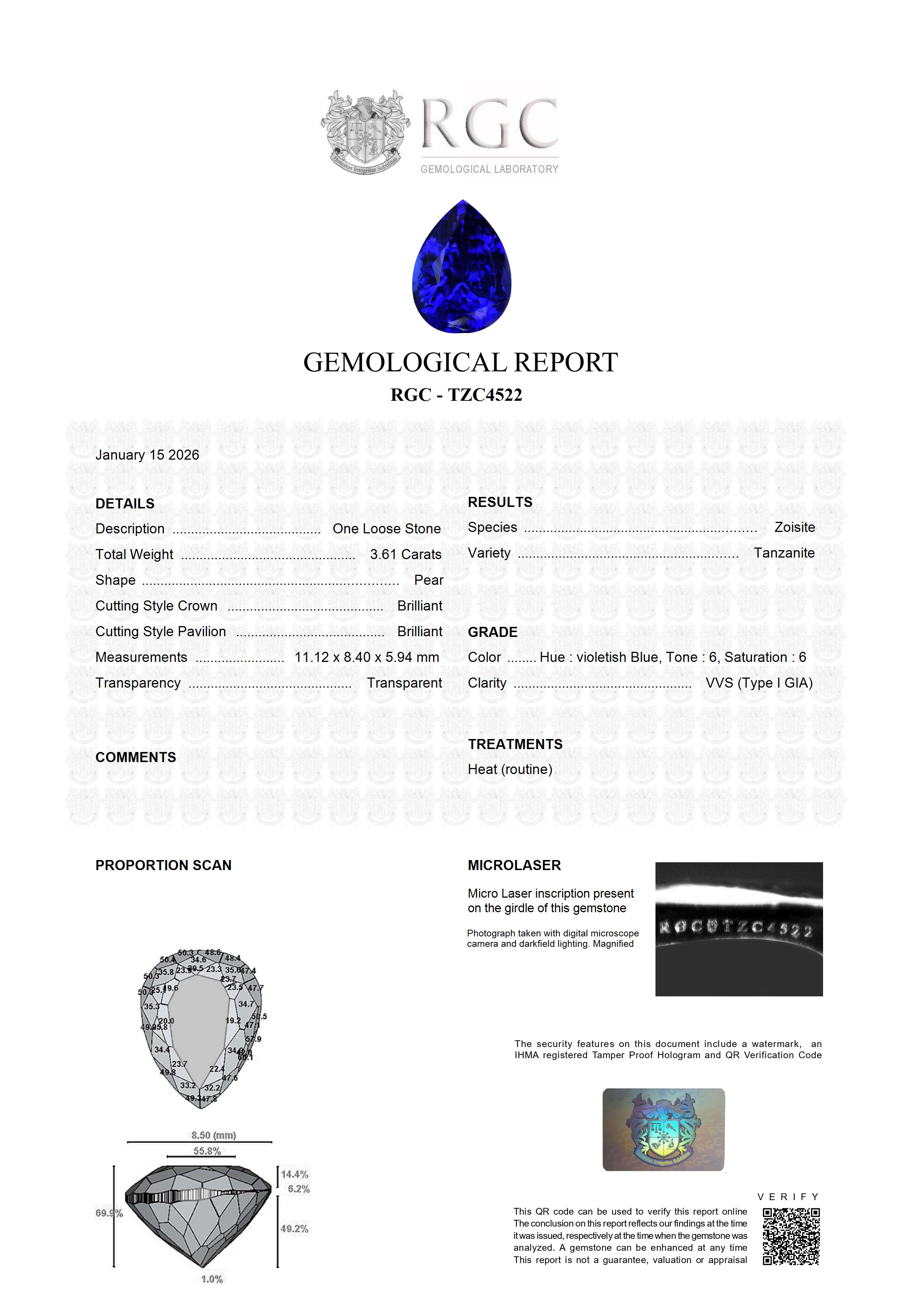 This Pear-shaped Tanzanite gemstone, weighing 3.61 carats, radiates an exceptional color intensity, scarce in today's market. Exceptional color saturation, flawless clarity and these attributes are beautifully set off by the cut which bestows plenty of life to the stone. A superb Tanzanite in all respects.