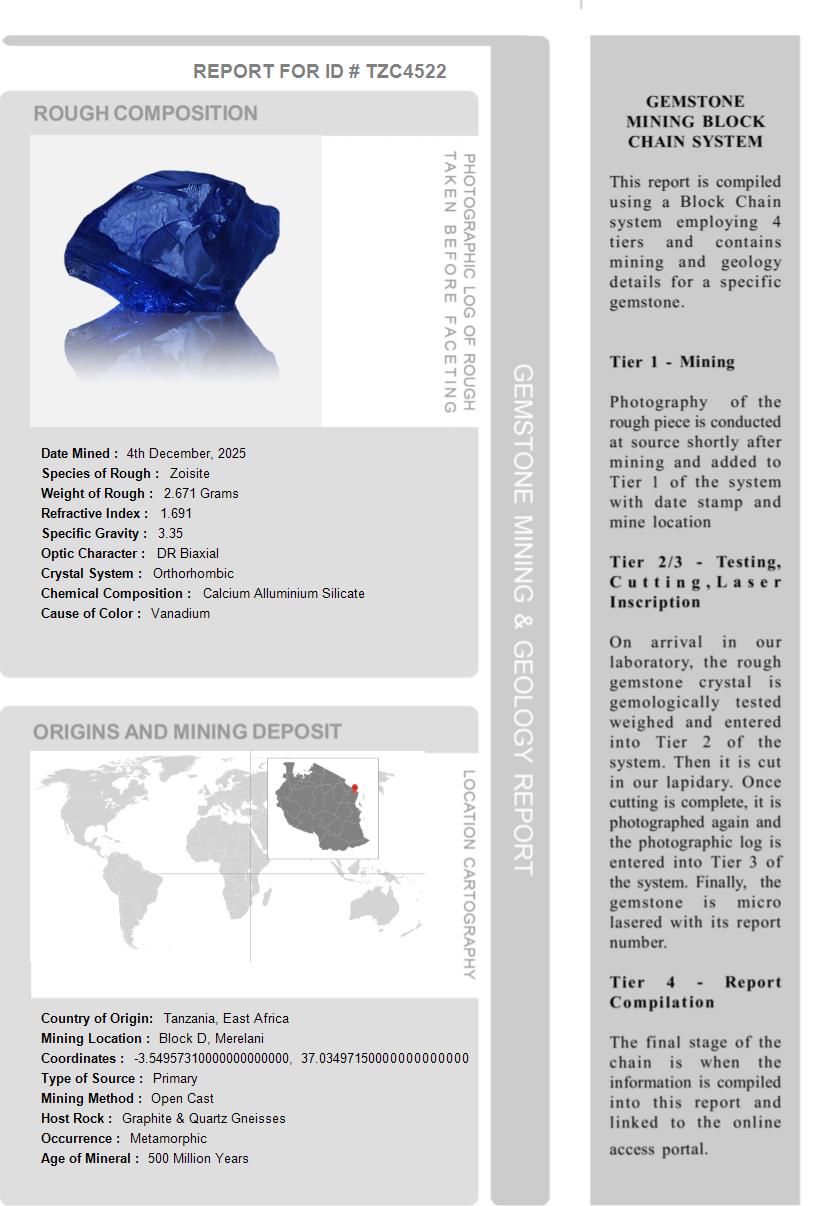 This Tanzanite is over 510 Million Years old. After being removed from the vein and "knocked" to remove the host rock, this Tanzanite weighed 2.671 Grams. The photograph on the left, shows it as it looked at this stage in its journey. Tests showed it has a Specific Gravity of 3.35, an optic character of DR Biaxial and it formed in the Othorhombic crystal system. Its Chemical Composition is Calcium Alluminium Silicate and its Cause of Color is Vanadium