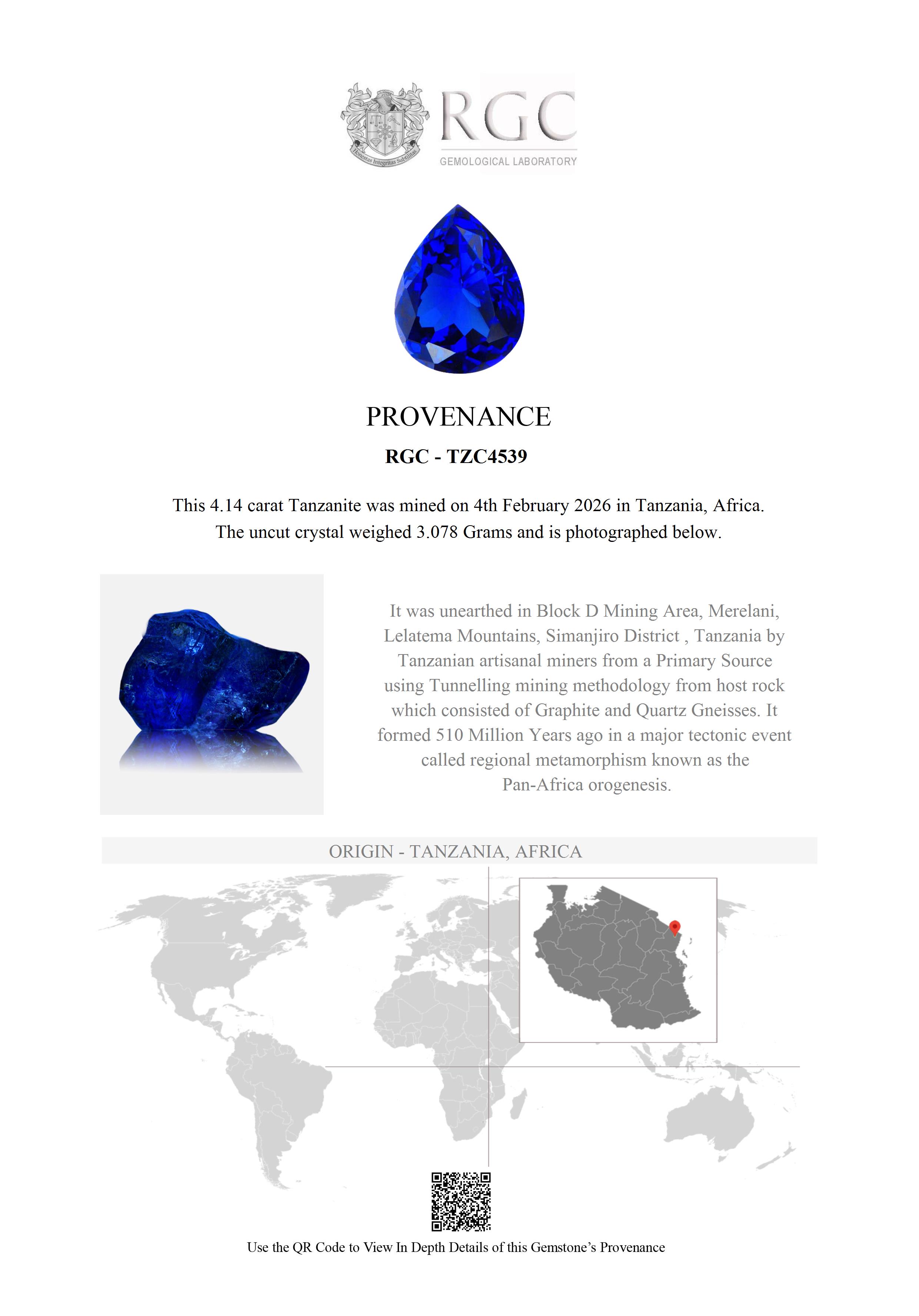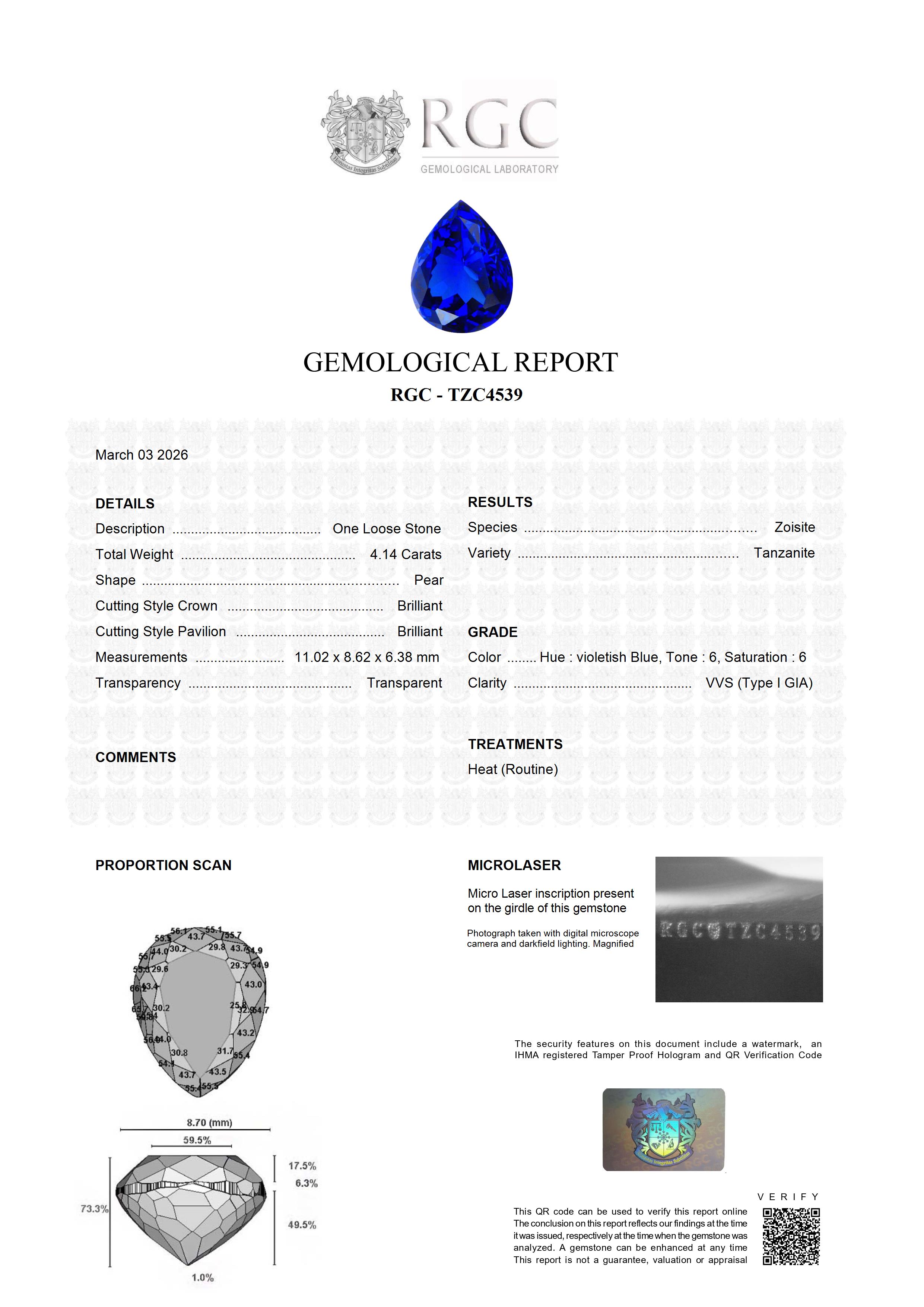 Vibrant is the word to describe this exceptional 4.14 carat Tanzanite pear. Beautifully cut with a myriad of pavilion facets to maximize brilliance. Intense Block D color saturation, displaying a dreamy vivid blue - An incredible Royal blue with exceptional intensity. Colors of this grade are found in less than 1% of Tanzanites mined. Excellent red flash effect under incandescent light. Entirely flawless. A rare Tanzanite indeed.
