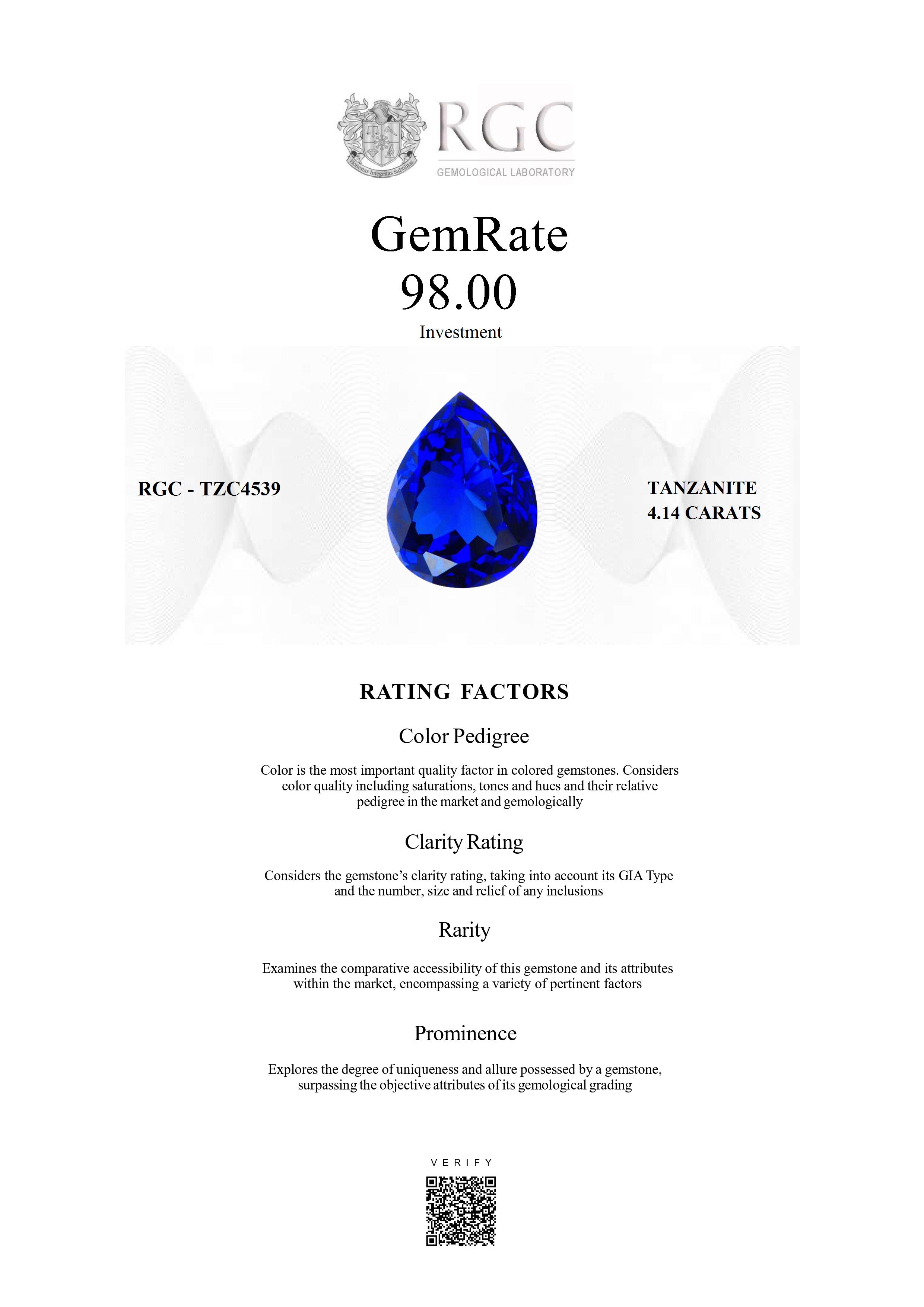 The RGC GemRate is a revolutionary system that addresses the importance and difficulty of comparing different colored gemstones with their peers in the marketplace. It assesses a wide variety of factors that exist in the marketplace and gemologically to classify gems in their genre using a standardized rating system. These factors are myriad but include quantifiable factors like color grade, clarity and cut, rarity factors examining relative rarity and also qualitative factors such as prominence, which examines the degree to which a gemstone stands out and captivates beyond just its measurable quality traits. It's essentially the stone's ability to catch attention and distinguish itself from others.