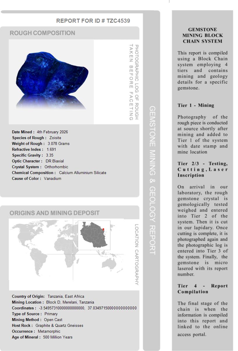 This Tanzanite is over 510 Million Years old. After being removed from the vein and "knocked" to remove the host rock, this Tanzanite weighed 3.078 Grams. The photograph on the left, shows it as it looked at this stage in its journey. Tests showed it has a Specific Gravity of 3.35, an optic character of DR Biaxial and it formed in the Othorhombic crystal system. Its Chemical Composition is Calcium Alluminium Silicate and its Cause of Color is Vanadium
