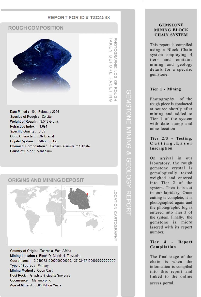 This Tanzanite is over 510 Million Years old. After being removed from the vein and "knocked" to remove the host rock, this Tanzanite weighed 3.543 Grams. The photograph on the left, shows it as it looked at this stage in its journey. Tests showed it has a Specific Gravity of 3.35, an optic character of DR Biaxial and it formed in the Othorhombic crystal system. Its Chemical Composition is Calcium Alluminium Silicate and its Cause of Color is Vanadium