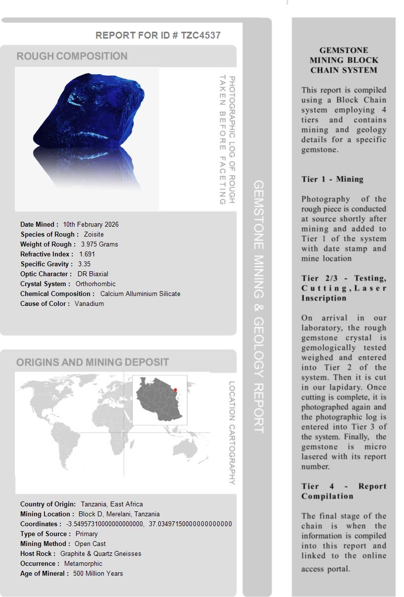 This Tanzanite is over 510 Million Years old. After being removed from the vein and "knocked" to remove the host rock, this Tanzanite weighed 3.975 Grams. The photograph on the left, shows it as it looked at this stage in its journey. Tests showed it has a Specific Gravity of 3.35, an optic character of DR Biaxial and it formed in the Othorhombic crystal system. Its Chemical Composition is Calcium Alluminium Silicate and its Cause of Color is Vanadium