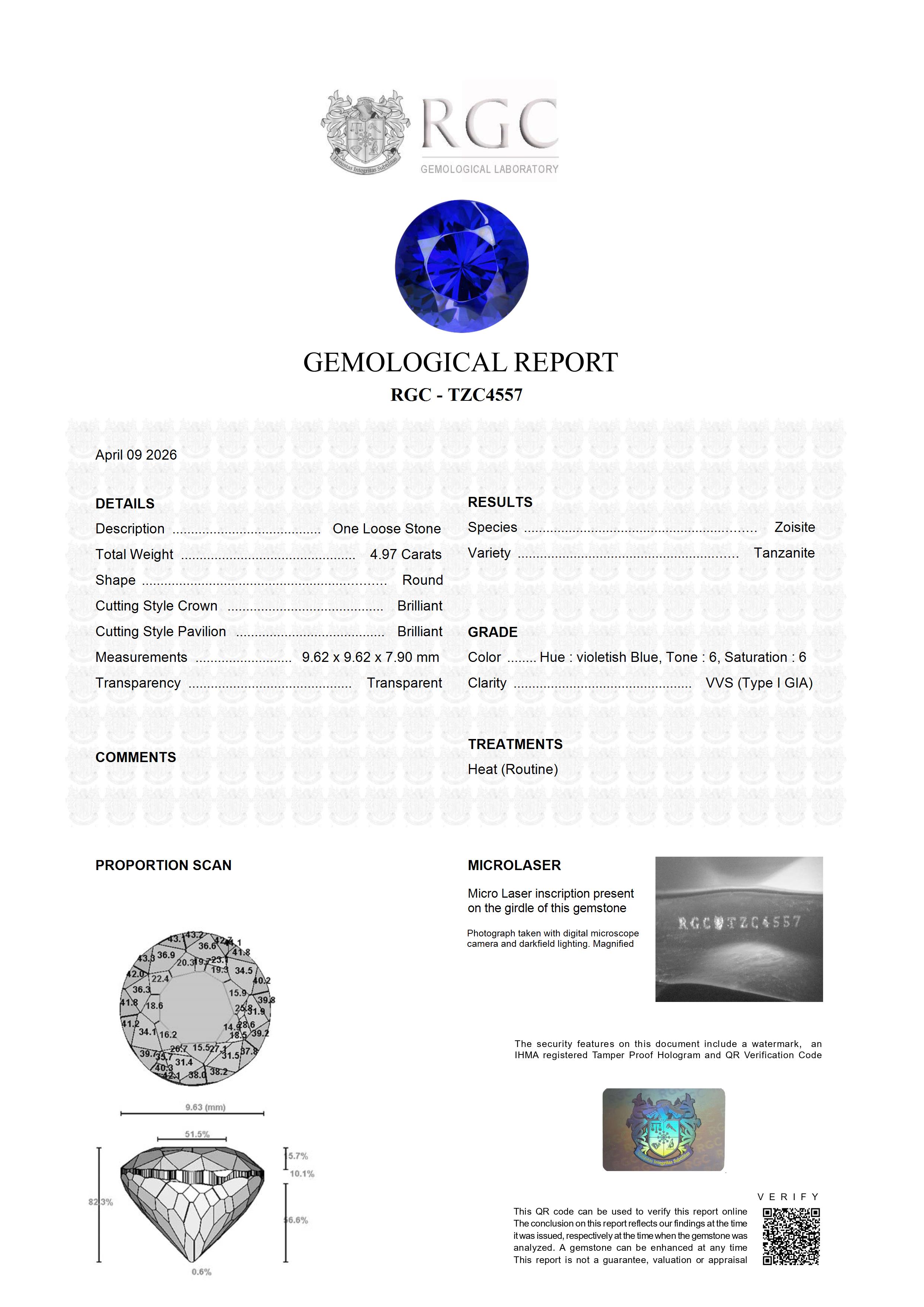 We specialize in the top 1% of Tanzanite mined and this special 5.97 carat round is a classic top 1 percenter. "Color is king" when it comes to Tanzanite. The deeper, more intense the color, the rarer and more valuable the stone. This beautiful, rare piece is very firmly in the top 1%. Exceptional color, cut directly on the blue axis, excellent cutting and flawless clarity. A rare and extremely beautiful Tanzanite.