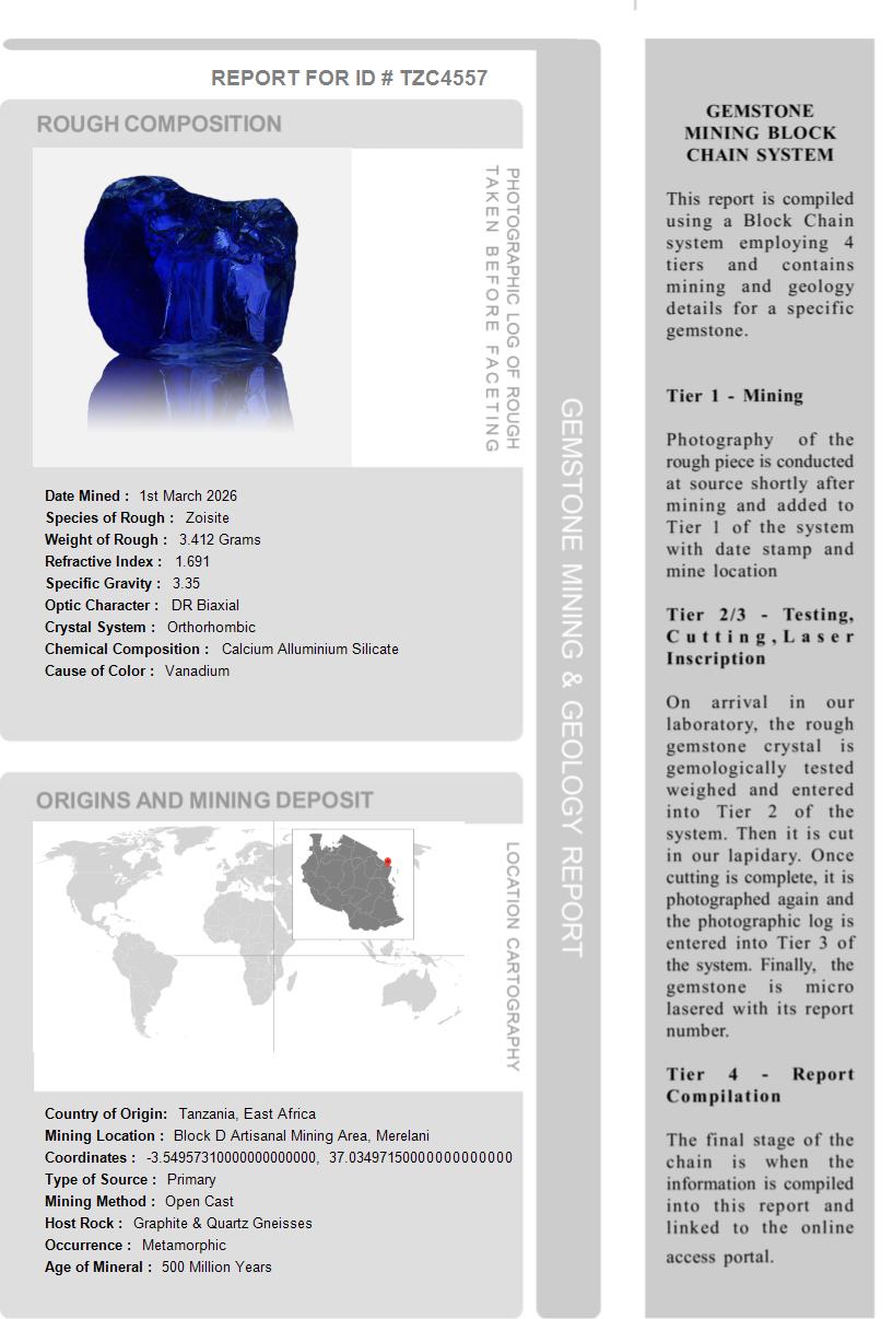 This Tanzanite is over 510 Million Years old. After being removed from the vein and "knocked" to remove the host rock, this Tanzanite weighed 3.412 Grams. The photograph on the left, shows it as it looked at this stage in its journey. Tests showed it has a Specific Gravity of 3.35, an optic character of DR Biaxial and it formed in the Othorhombic crystal system. Its Chemical Composition is Calcium Alluminium Silicate and its Cause of Color is Vanadium