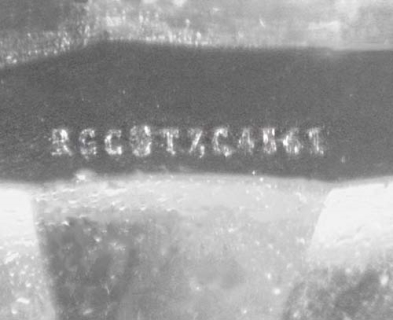 This image is an actual photograph of the laser inscription on this particular gemstone. Photography is done using a microscope camera at 45 x magnification to render the image.