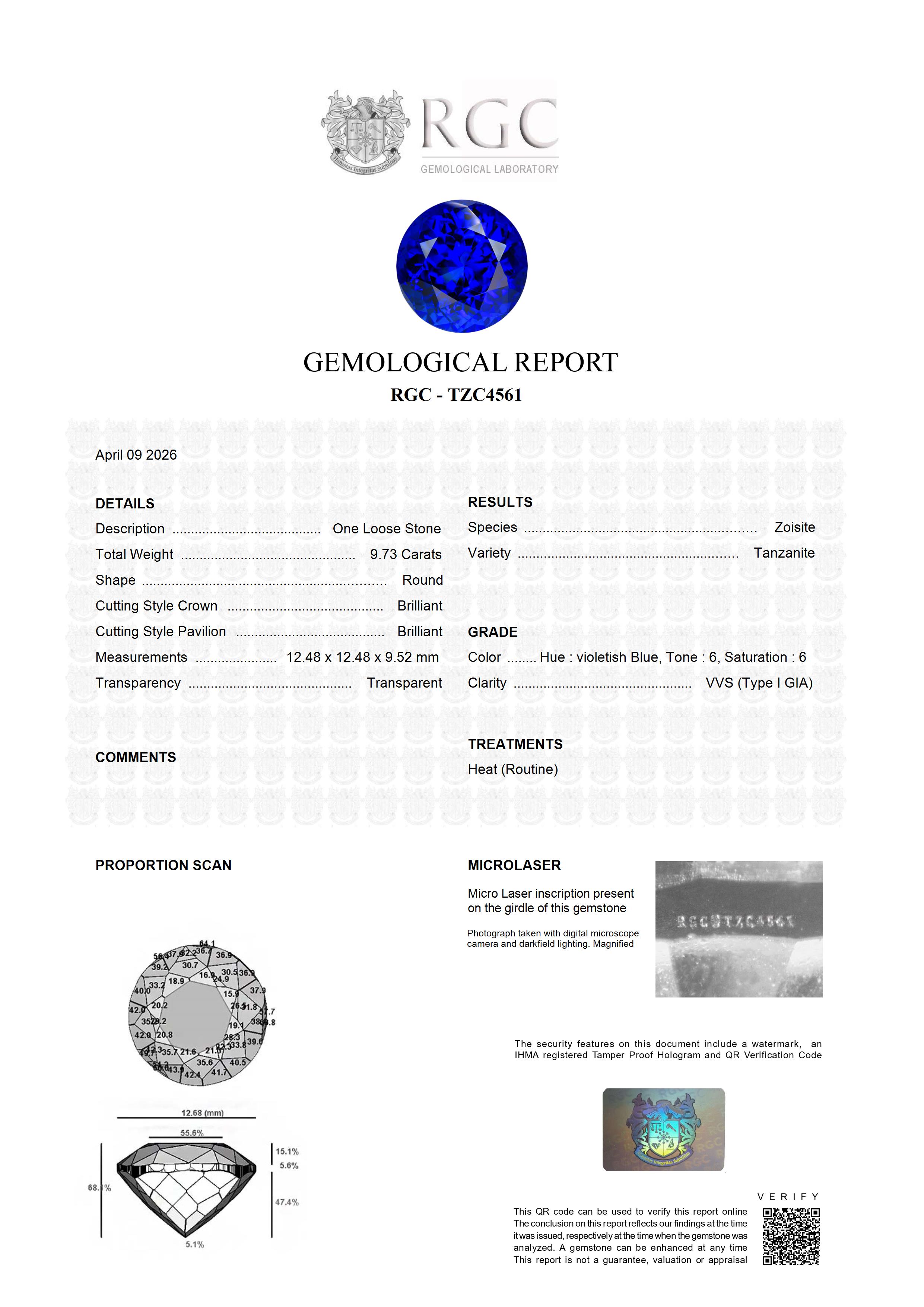 If you are looking for a Tanzanite that rivals the finest Sapphire, then look no further. This stunning 9.73 Carat Round is a dream stone. You just don't see Tanzanites like this any more. The color is a deep, vivid almost velvet Blue that even a Kashmir Sapphire would envy. Light explodes from within its depths driven by a myriad of facets on its pavilion. Wonderful cutting and flawless clarity add to its unrivaled pedigree. The pinnacle of Tanzanite pedigree.