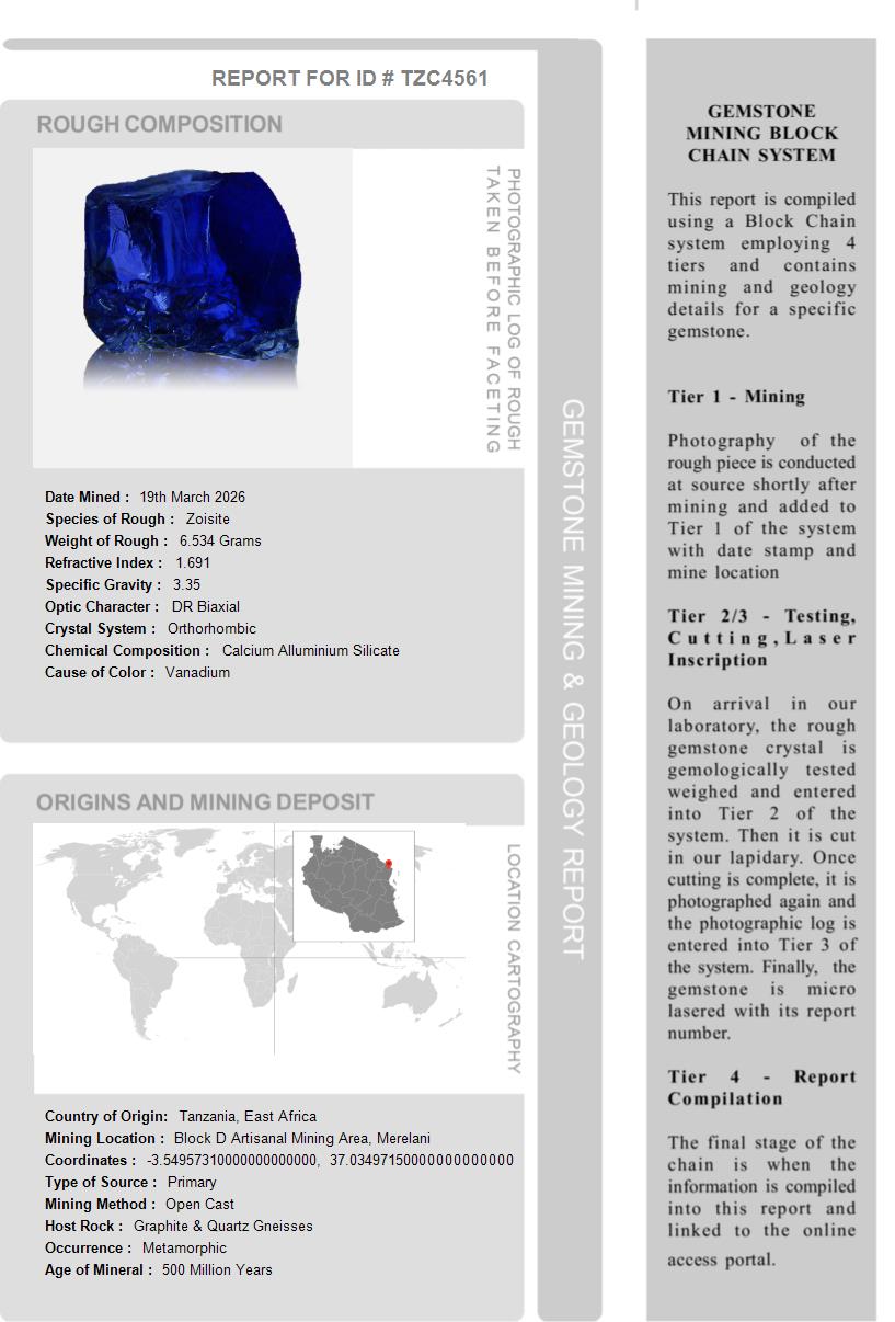 This Tanzanite is over 510 Million Years old. After being removed from the vein and "knocked" to remove the host rock, this Tanzanite weighed 6.534 Grams. The photograph on the left, shows it as it looked at this stage in its journey. Tests showed it has a Specific Gravity of 3.35, an optic character of DR Biaxial and it formed in the Othorhombic crystal system. Its Chemical Composition is Calcium Alluminium Silicate and its Cause of Color is Vanadium