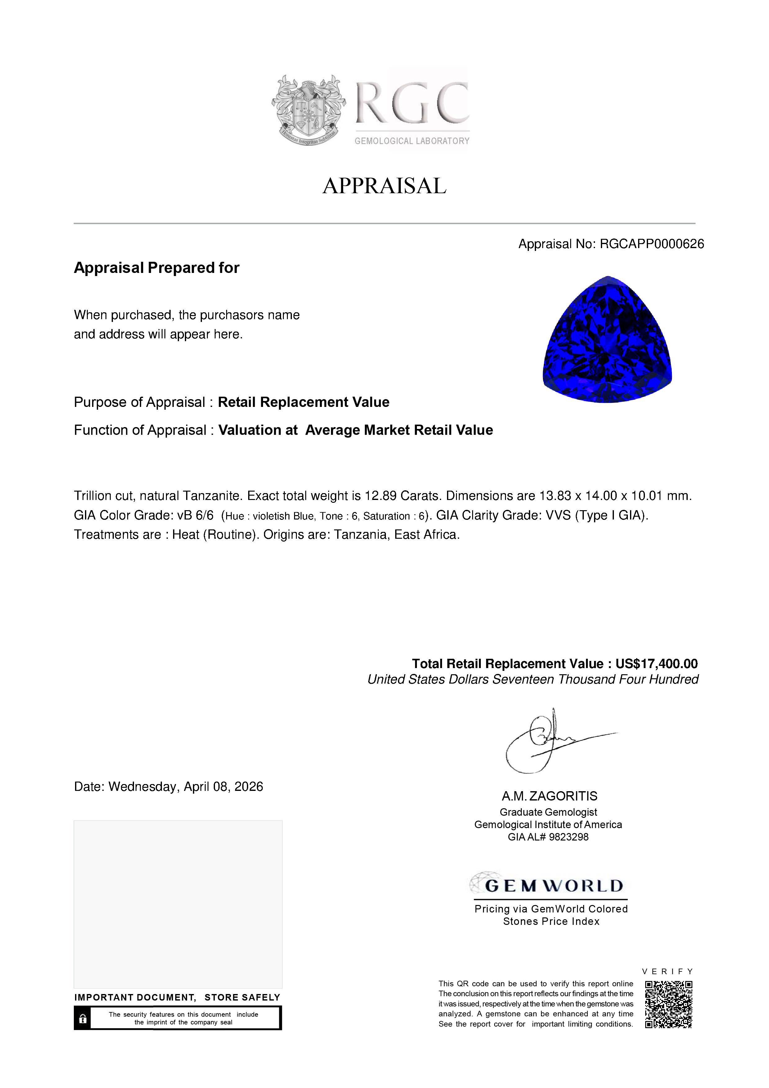 This is an extremely beautiful Tanzanite indeed. There seems to be no end to its velvety depths. An incredible Royal Blue that defies description. Reminiscent of the early days of Tanzanite mining. You don't see these every day.Flawless clarity and wonderful brilliance complete the package. It is above the 10 carat investor's benchmark, making it even more special.