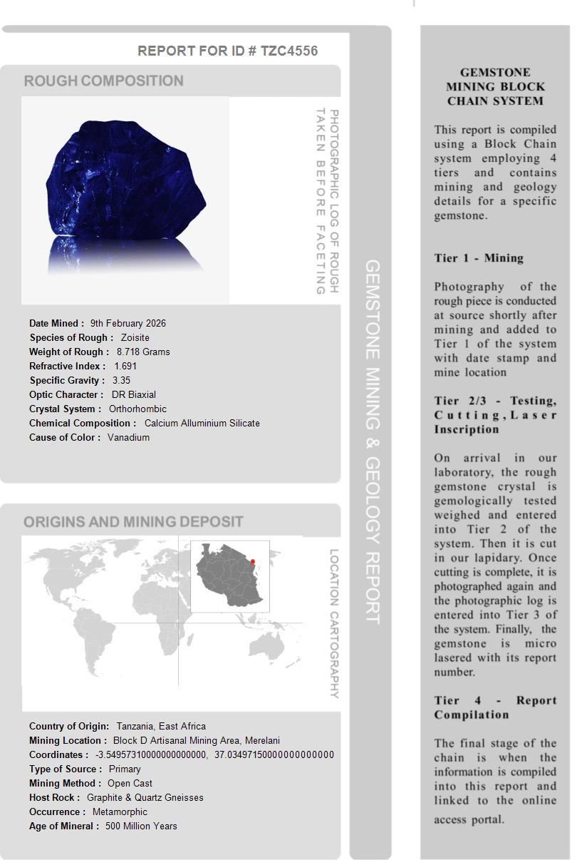 This Tanzanite is over 510 Million Years old. After being removed from the vein and "knocked" to remove the host rock, this Tanzanite weighed 8.718 Grams. The photograph on the left, shows it as it looked at this stage in its journey. Tests showed it has a Specific Gravity of 3.35, an optic character of DR Biaxial and it formed in the Othorhombic crystal system. Its Chemical Composition is Calcium Alluminium Silicate and its Cause of Color is Vanadium