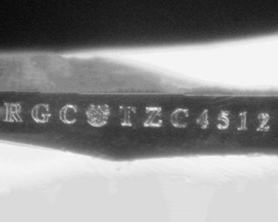 This image is an actual photograph of the laser inscription on this particular gemstone. Photography is done using a microscope camera at 45 x magnification to render the image.
