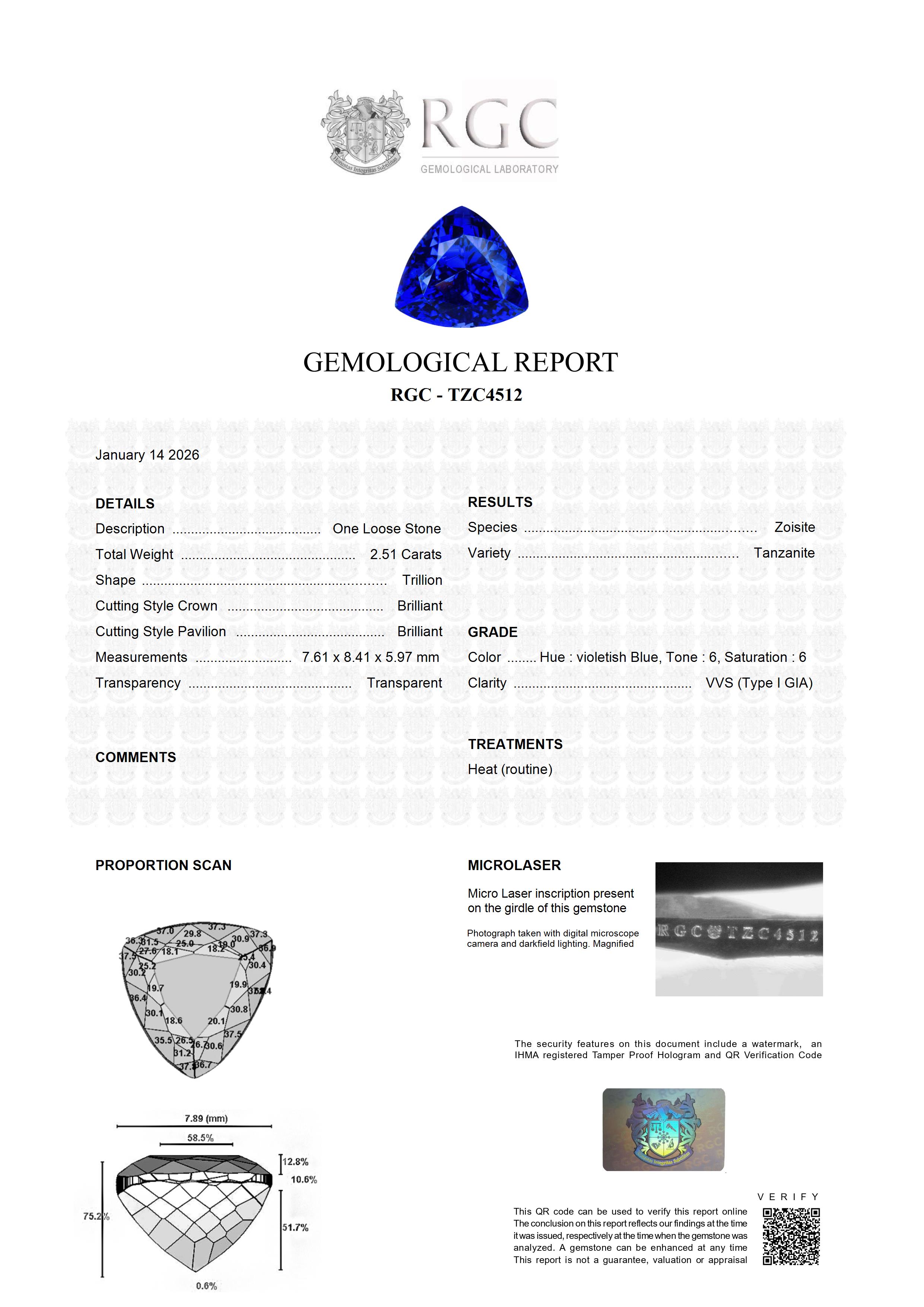 This striking 2.51 carat Trillion Cut Tanzanite is a splendid piece, flaunting a beautiful deep blue hue in daylight with captivating red flash when exposed to incandescent light. The combination of top color, clarity and exceptional quality is a rare discovery, making this Tanzanite an exquisite addition to any collection.