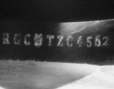 This image is an actual photograph of the laser inscription on this particular gemstone. Photography is done using a microscope camera at 45 x magnification to render the image.