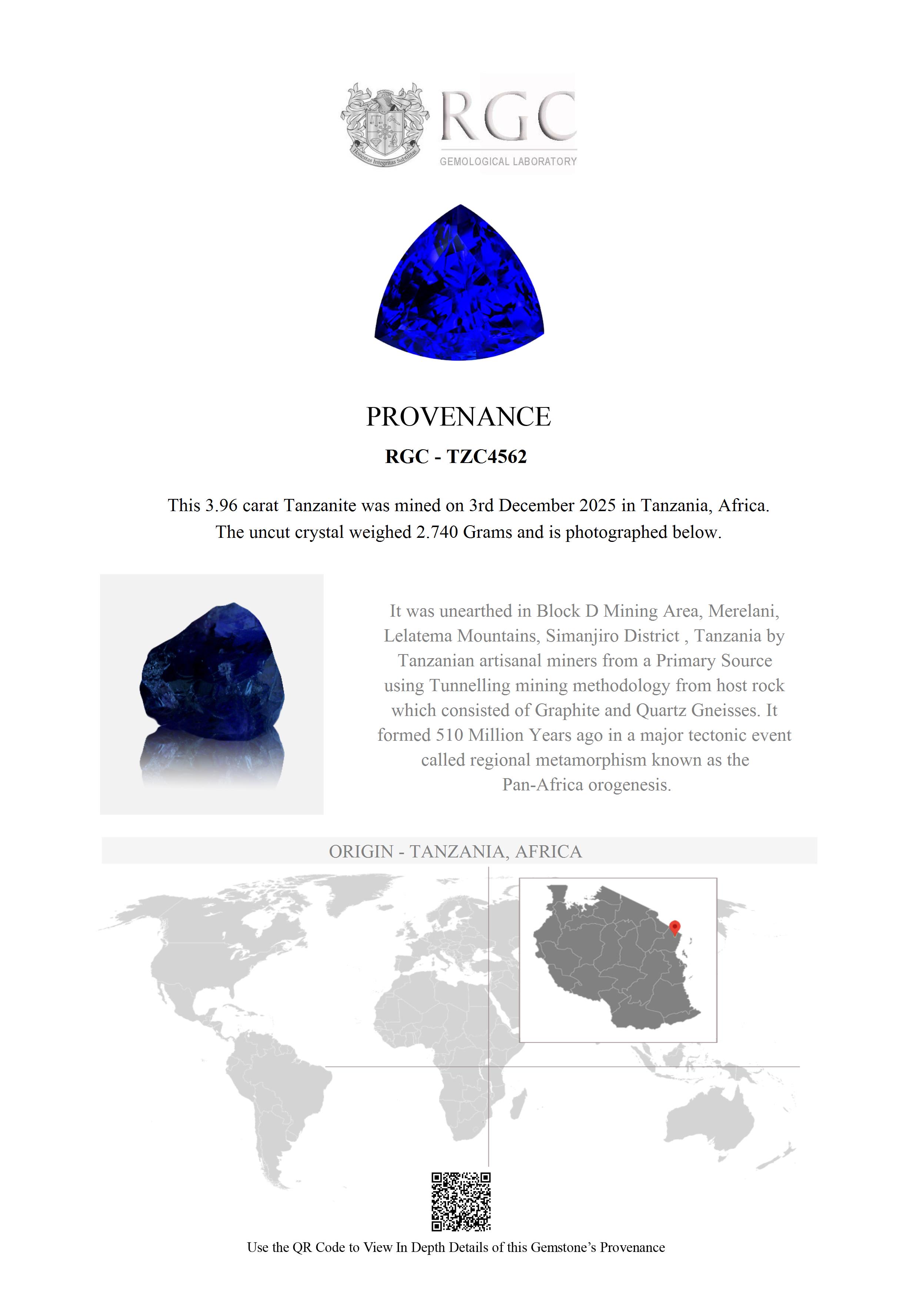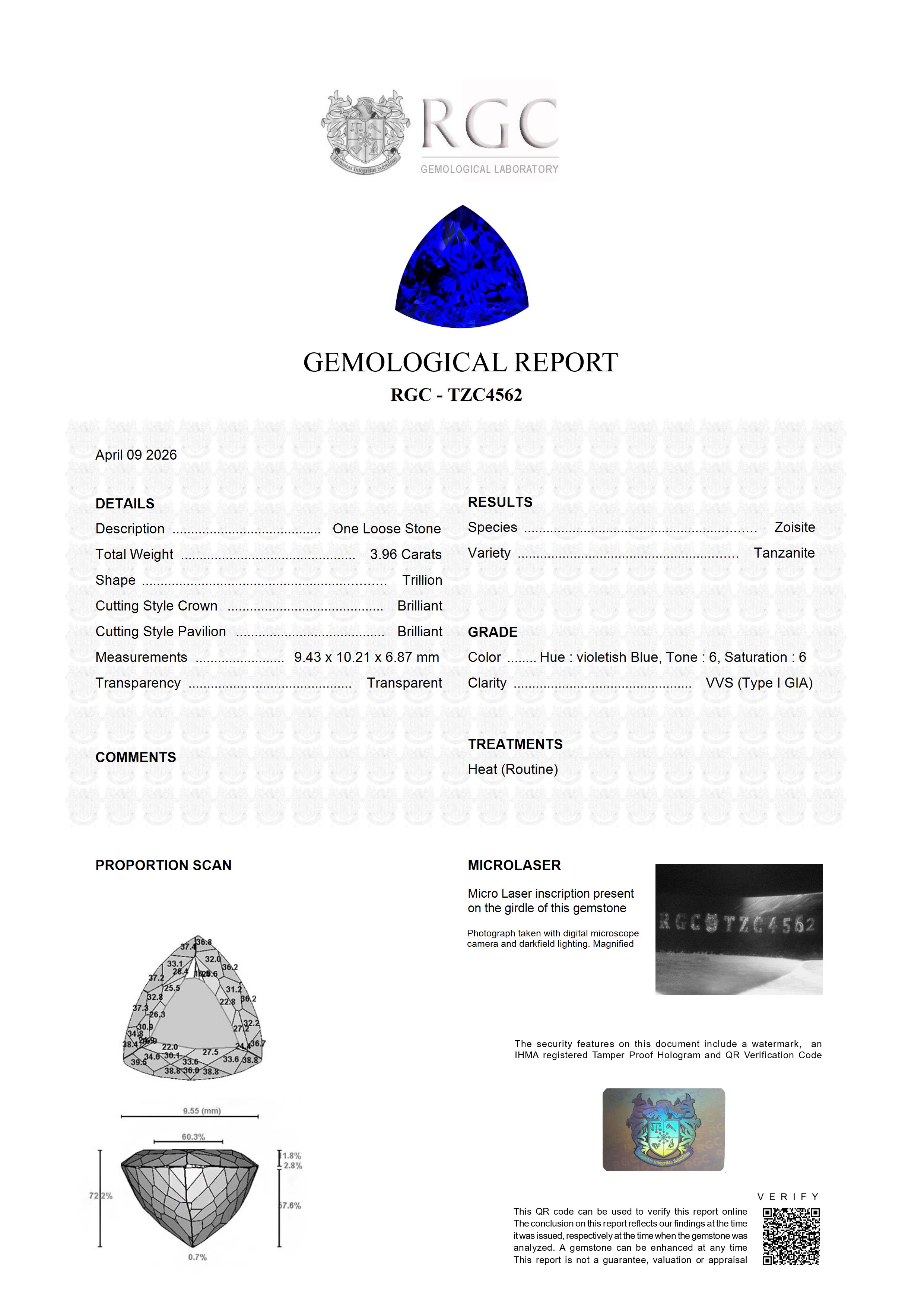 Very rarely seen in the market. This 3.96 carat Trillion Cut Tanzanite displays a very intense color that is rare in Tanzanites of smaller sizes. This particular color is found in less than 1% of Tanzanites but is exponentially rarer in stones under 5 carats. This is an absolutely exceptional Tanzanite. Perfect in all respects. Unparalleled Block D color - a truly superb depth of color reminiscent of the "old days" of Tanzanite mining. Flawless and intense, this outstanding gemstone is the quintessential investment piece.