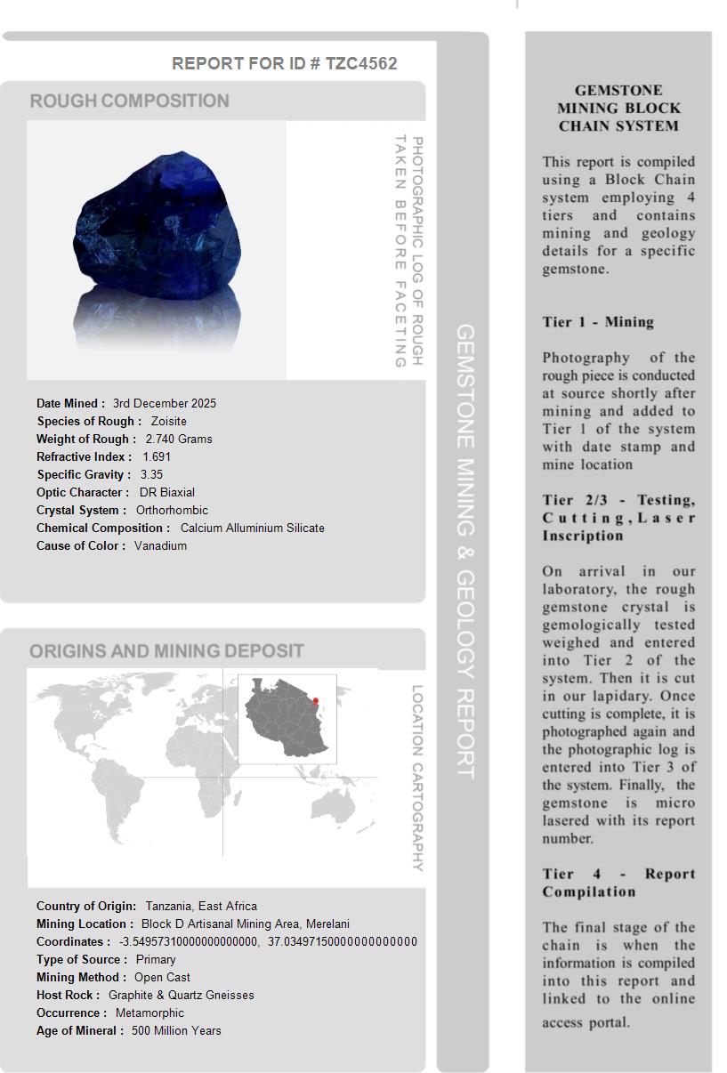 This Tanzanite is over 510 Million Years old. After being removed from the vein and "knocked" to remove the host rock, this Tanzanite weighed 2.740 Grams. The photograph on the left, shows it as it looked at this stage in its journey. Tests showed it has a Specific Gravity of 3.35, an optic character of DR Biaxial and it formed in the Othorhombic crystal system. Its Chemical Composition is Calcium Alluminium Silicate and its Cause of Color is Vanadium