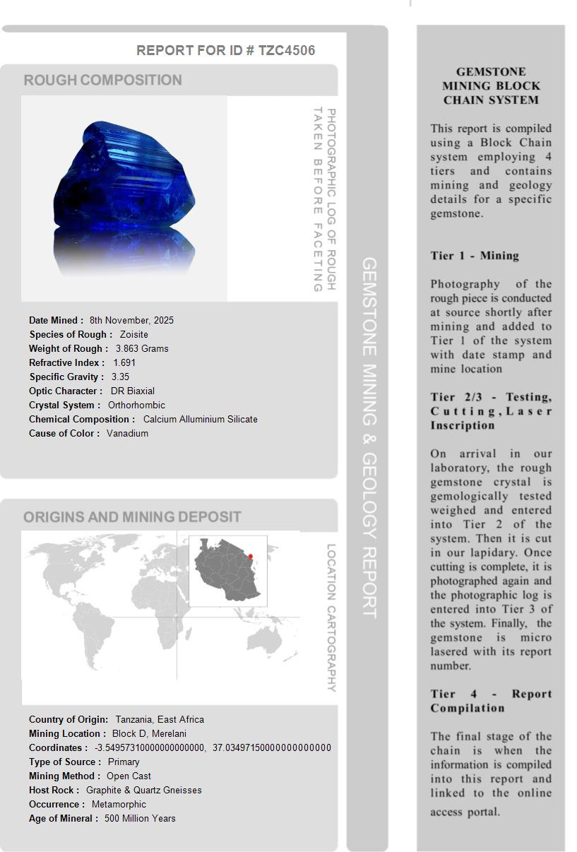 This Tanzanite is over 510 Million Years old. After being removed from the vein and "knocked" to remove the host rock, this Tanzanite weighed 3.863 Grams. The photograph on the left, shows it as it looked at this stage in its journey. Tests showed it has a Specific Gravity of 3.35, an optic character of DR Biaxial and it formed in the Othorhombic crystal system. Its Chemical Composition is Calcium Alluminium Silicate and its Cause of Color is Vanadium