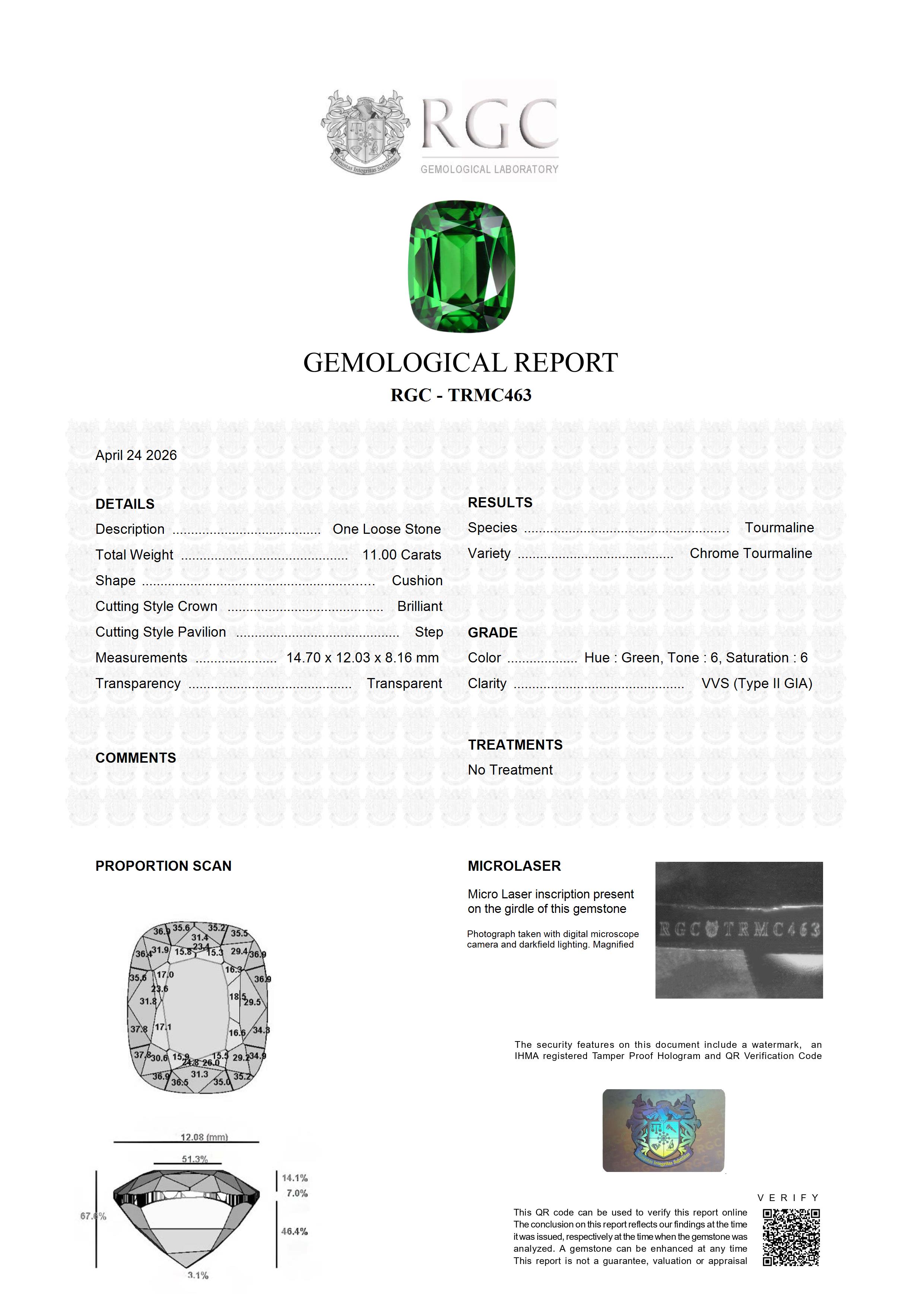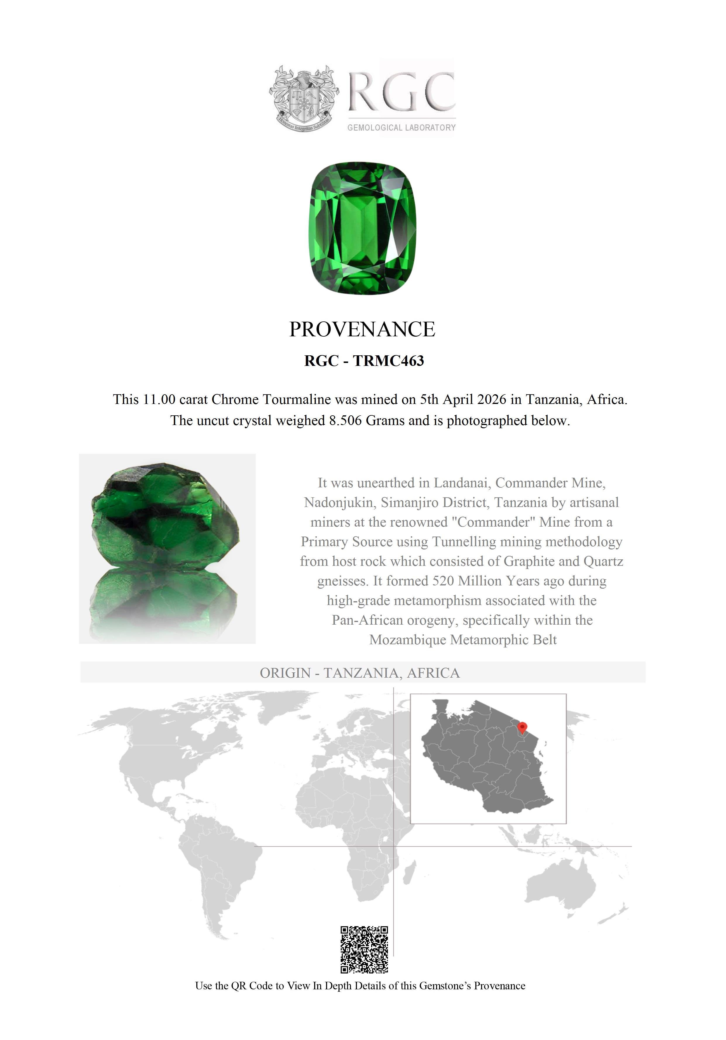 The quintessential Collector / Investor Tourmaline. From the celebrated chromium-bearing grounds of Landanai, Tanzania, comes a gemstone that stops the room. This 11-carat chrome tourmaline is, in the truest sense of the phrase, a once-in-a-career stone. Its green is absolute — deep, pure, and uncompromising, driven by chromium, the same noble element responsible for the colour of the world's finest emeralds. There are no grey undertones, no watery dilution, no apology. Just green, rich and alive, glowing from within like light filtered through an ancient forest canopy. The clarity is flawless. In chrome tourmaline — a variety where inclusions are practically a given — this alone would be remarkable. In an 11-carat stone, it borders on the miraculous. But it is the size that renders this specimen truly extraordinary. Chrome tourmalines of collector quality are scarce above five carats. Above ten, with flawless clarity and colour of this purity, they are essentially unknown. In decades of handling fine coloured gemstones, we have never encountered one like it. Some stones are beautiful. This one is historic.
