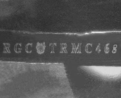 This image is an actual photograph of the laser inscription on this particular gemstone. Photography is done using a microscope camera at 45 x magnification to render the image.