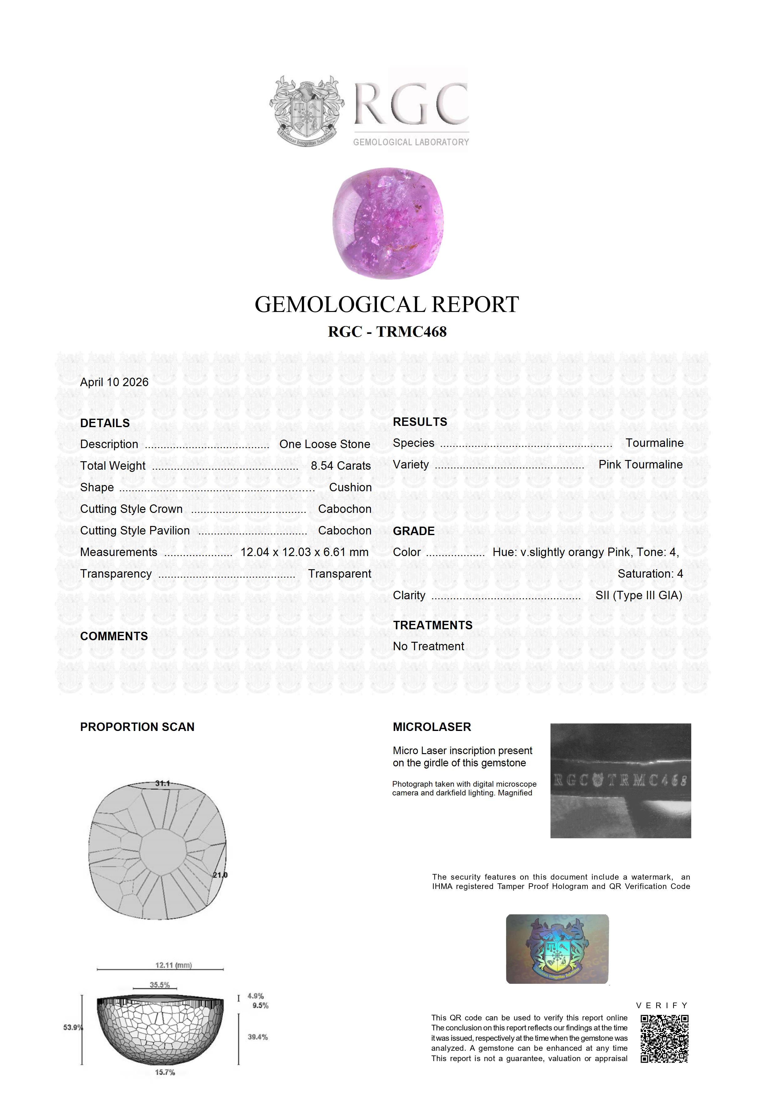 Pink Tourmaline (Type III) I2 Clarity refers to the number and size of inclusions within a gemstone. This clarity survey is a description of the exact type of inclusions, if any, contained in this gem.