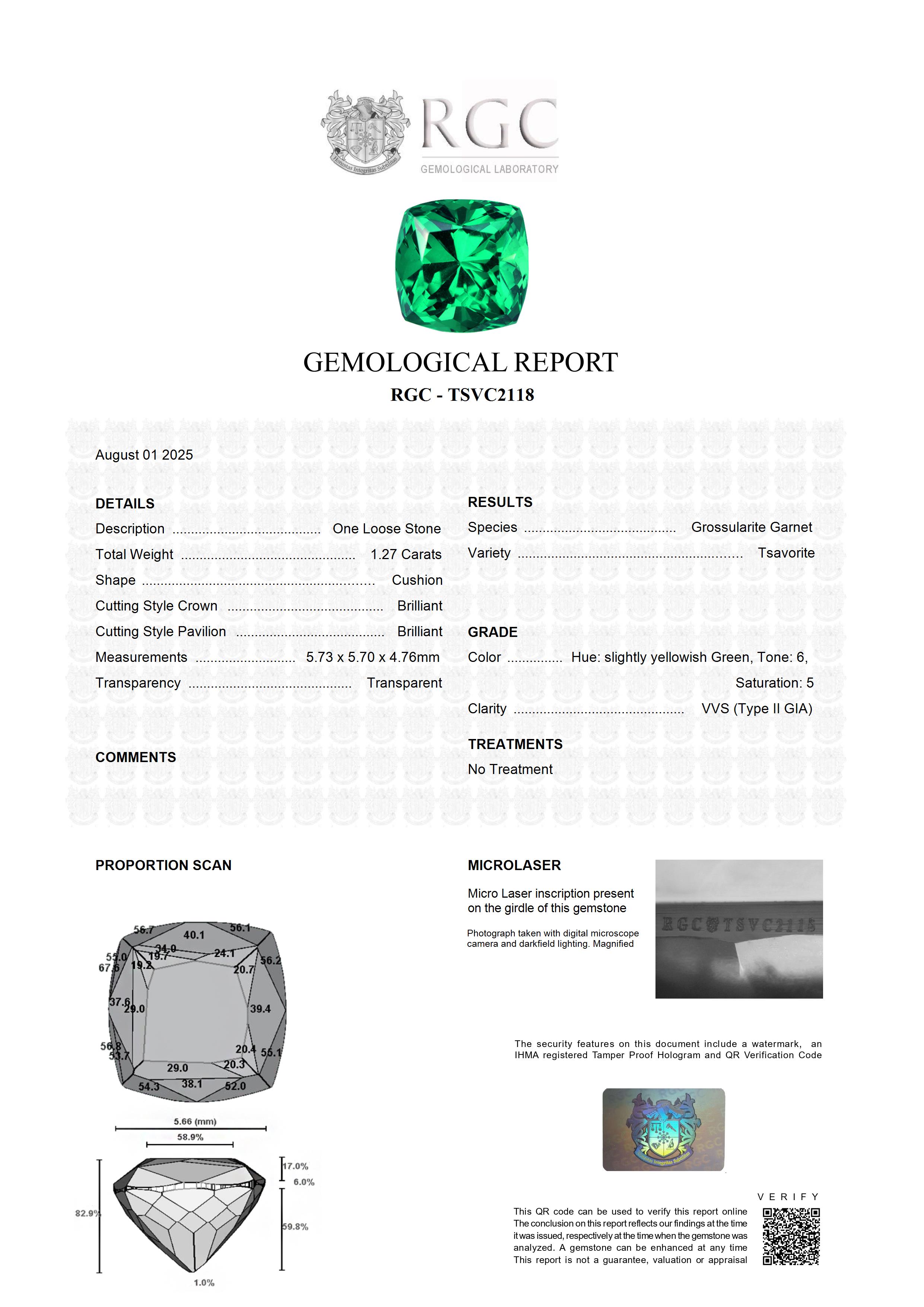This stunning Cushion Brilliant Tsavorite exudes explosive brilliance, setting it apart as an exceptional gem sourced from Kenya. Weighing 1.27 carats and measuring 5.73 x 5.70 x 4.76mm, it showcases excellent cutting and proportions. Its square cushion shape is a very versatile shape when it comes to setting. What makes this Tsavorite truly noteworthy is its superb color, a vibrant and pure green. Perfectly flawless, it possesses no inclusions, providing remarkable clarity. Exceptional, versatile, and vibrant, this Tsavorite is a magnificent choice.