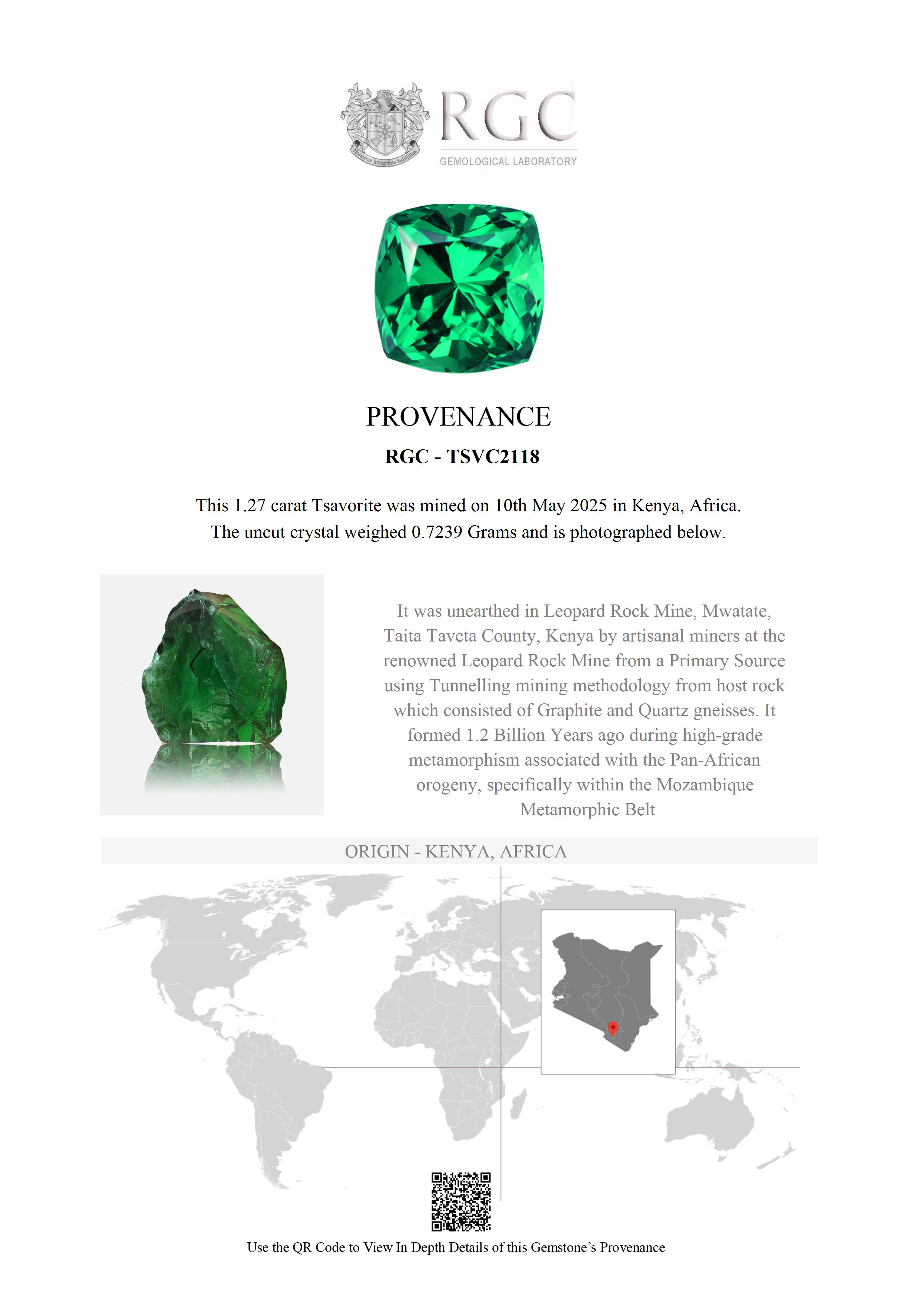 Mined on 10th May, 2025 in Leopard Rock Mine, Mwatate, Taita Taveta County, Kenya, AfricaThis Tsavorite is over 1.2 Billion Years old. After being removed from the vein and "knocked" to remove the host rock, this Tsavorite weighed 0.7239 Grams. The photograph on the left, shows it as it looked at this stage in its journey. Tests showed it has a Specific Gravity of 3.61, an optic character of SR and it formed in the Othorhombic crystal system. Its Chemical Composition is Calcium Alluminium Silicate and its Cause of Color is Vanadium