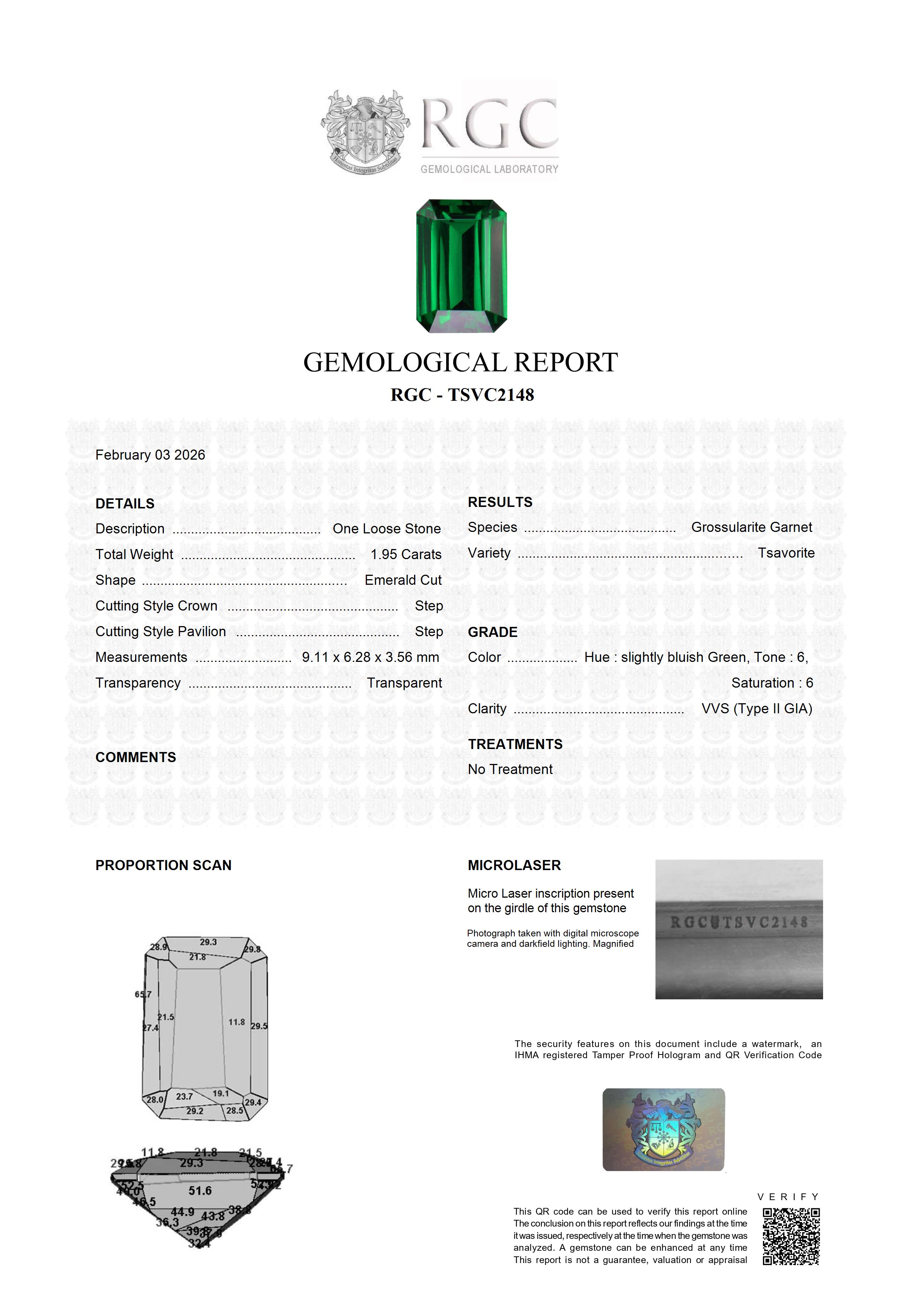 This lovely elegant Emerald cut exudes gorgeous vivid green hues - optimal tone and saturation levels with a rare blue modifier. A coveted color amongst true connoisseurs of Tsavorite. At 1.95 carats it is in the "sweet spot" before the 2 carat price kicks in but the stone looks like a 2 carater. A superb Tsavorite.