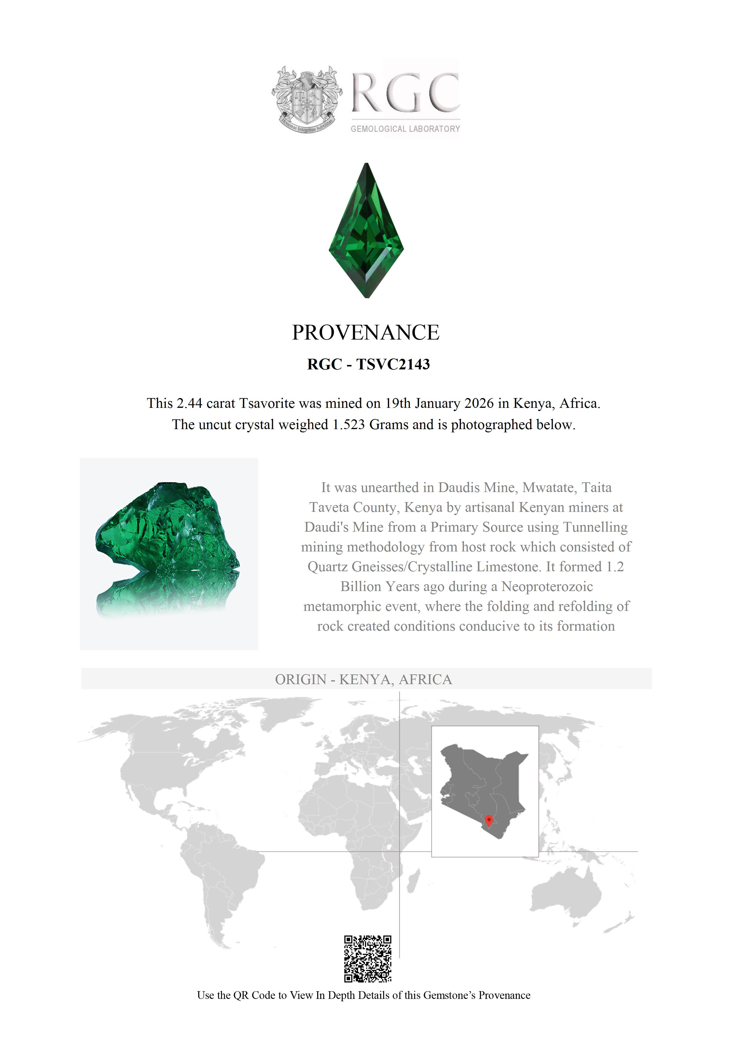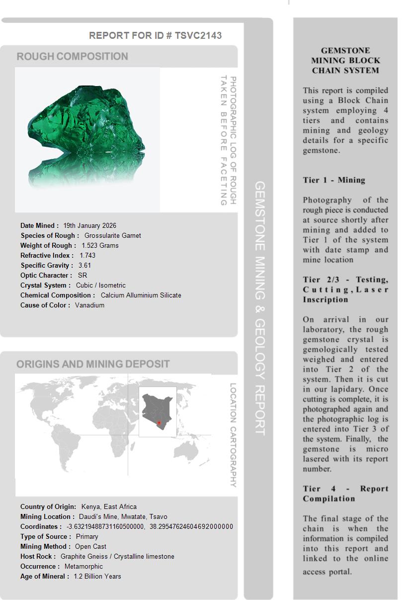 Our master cutters have over 30 years of cutting experience each and take great pride in cutting the best shape and style to capture the beauty of each piece. This wonderful Tsavorite is no exception and it was painstakingly fashioned, facet by facet into the beautiful piece you see today. This is a very special and very rare piece of nature.